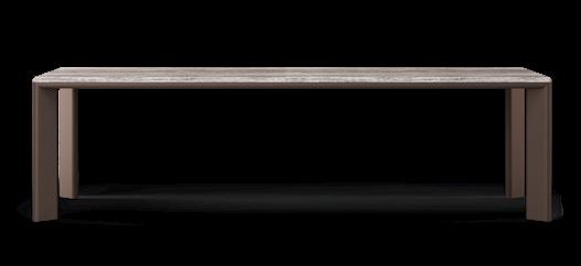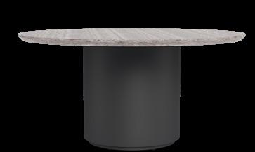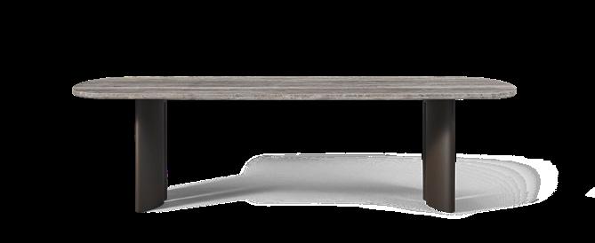Table Shown in Aluminum Bronze Base and Travertine Grey Top.