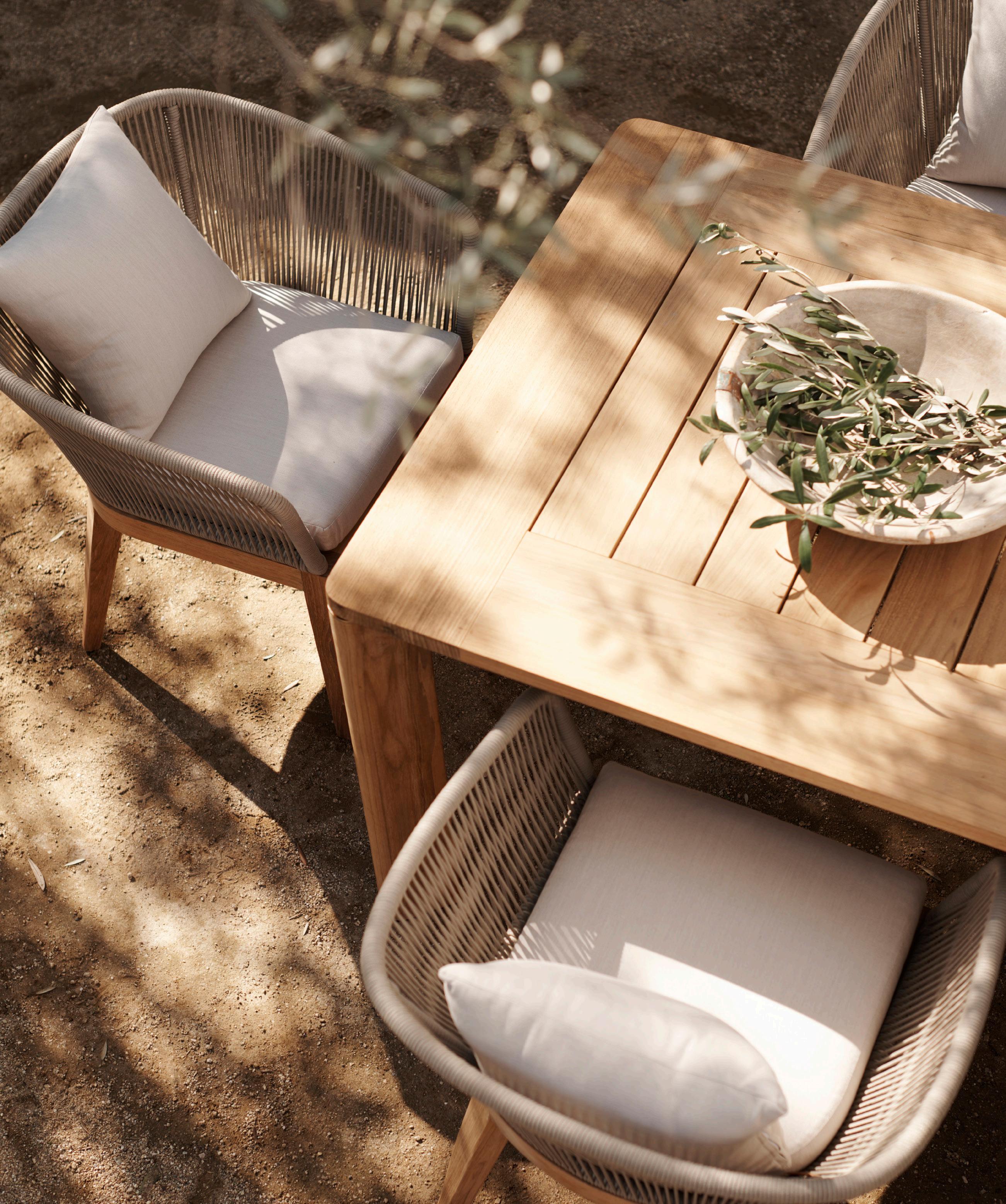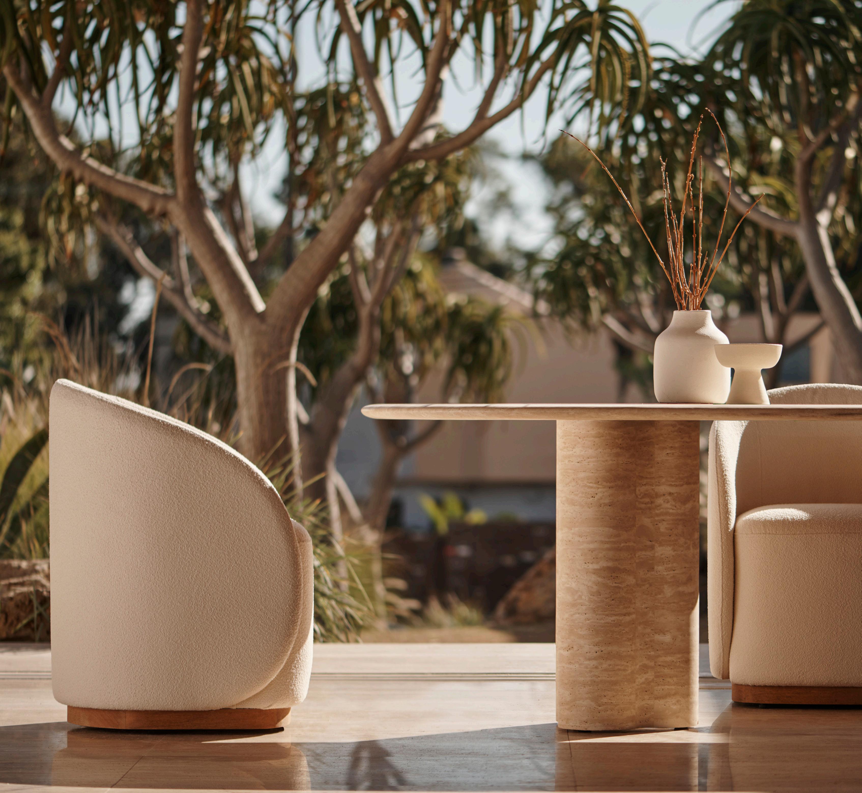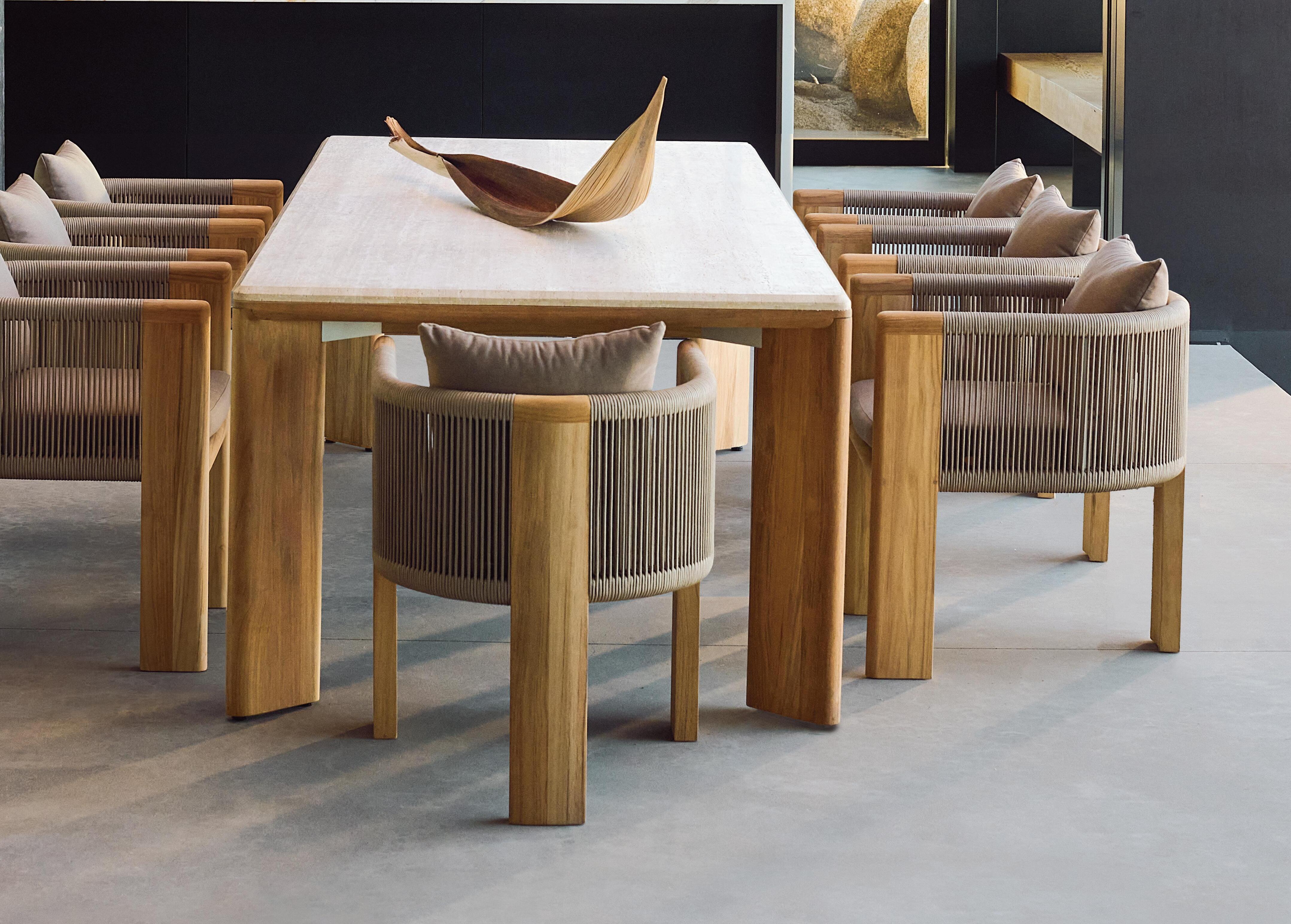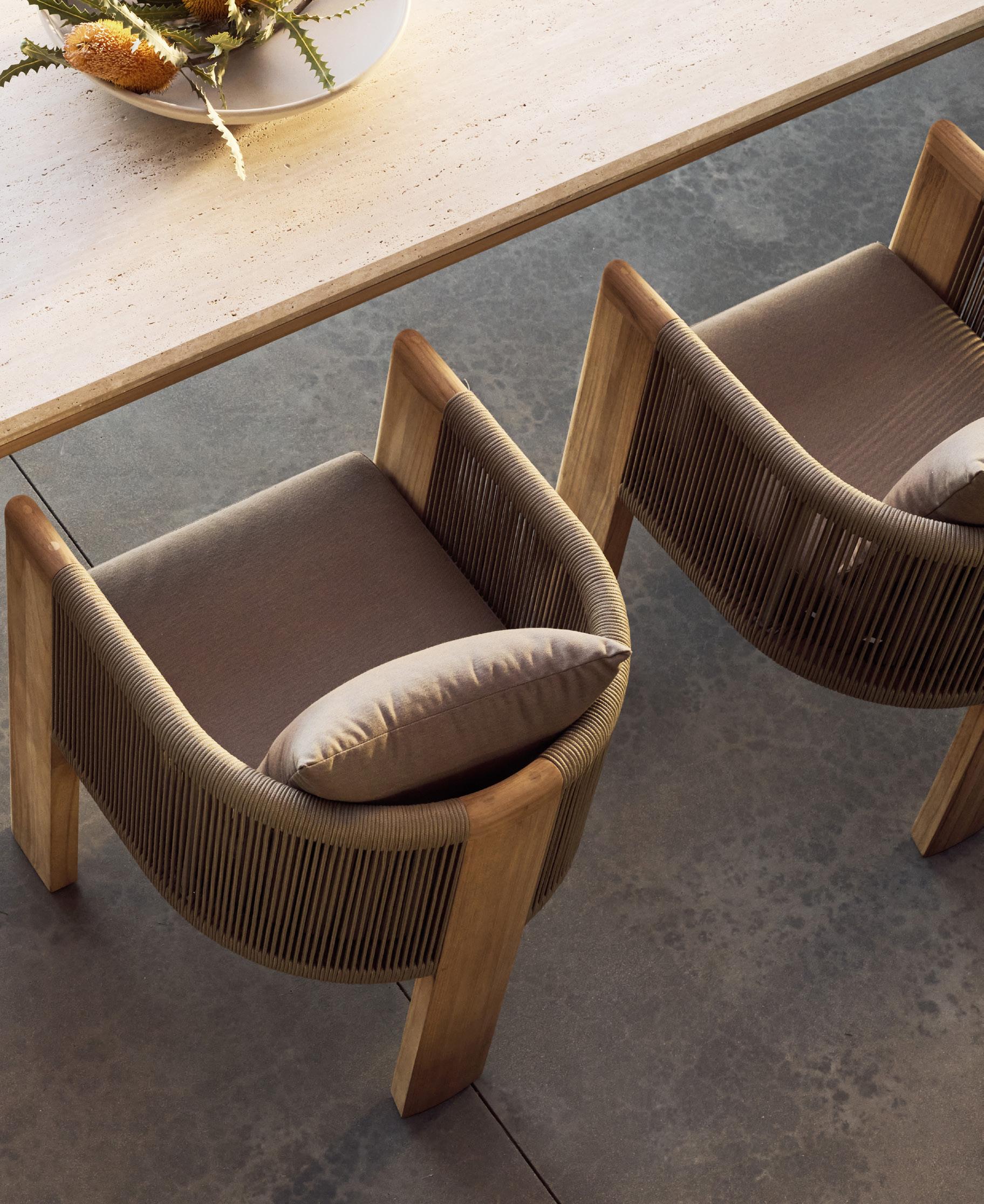 A nod to Sydney’s iconic Palm Beach with its stately coastal pines. Rounded backs, vertical rope detailing and a harmonious mix of materials infuse classic silhouettes with modern elegance.
