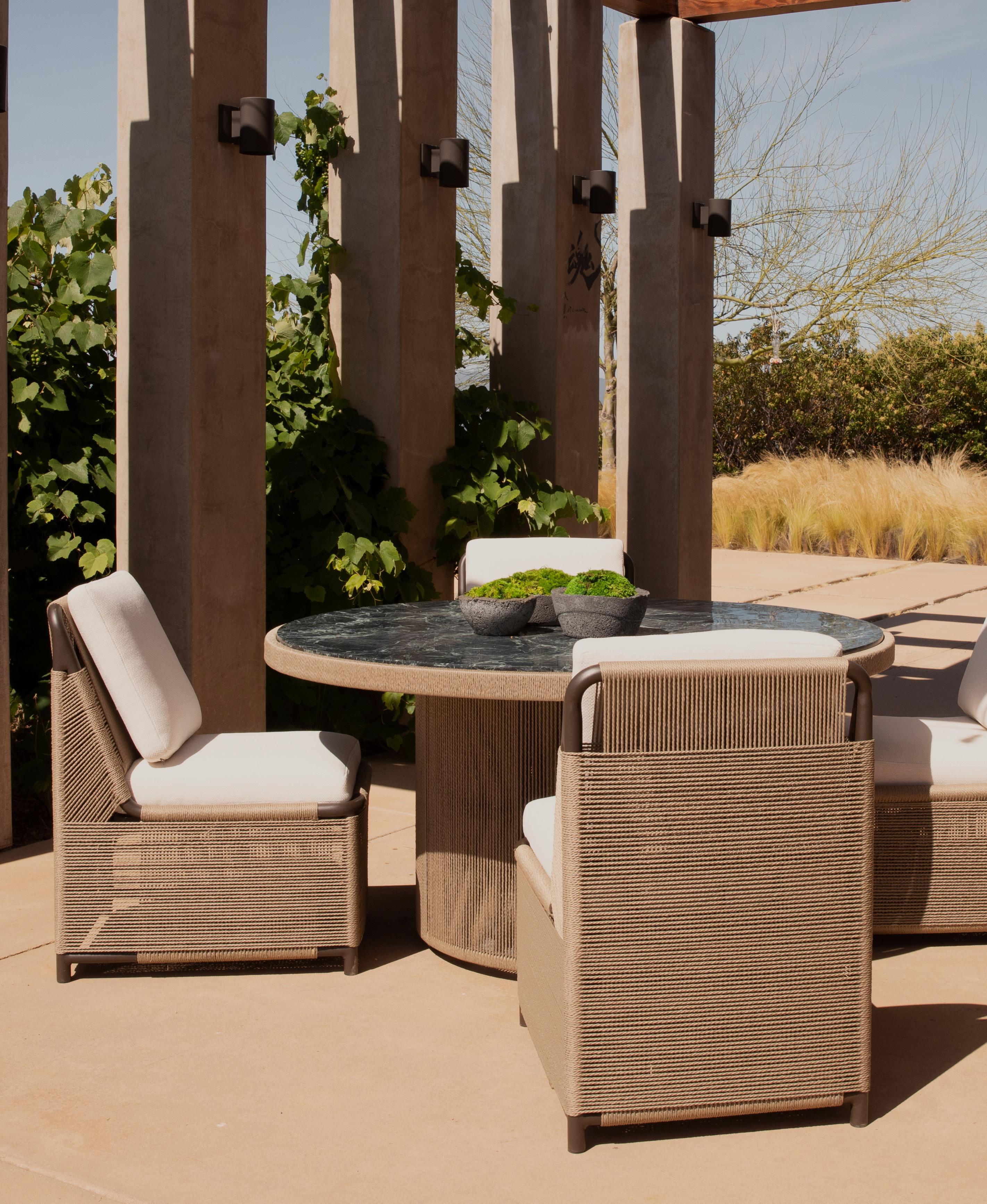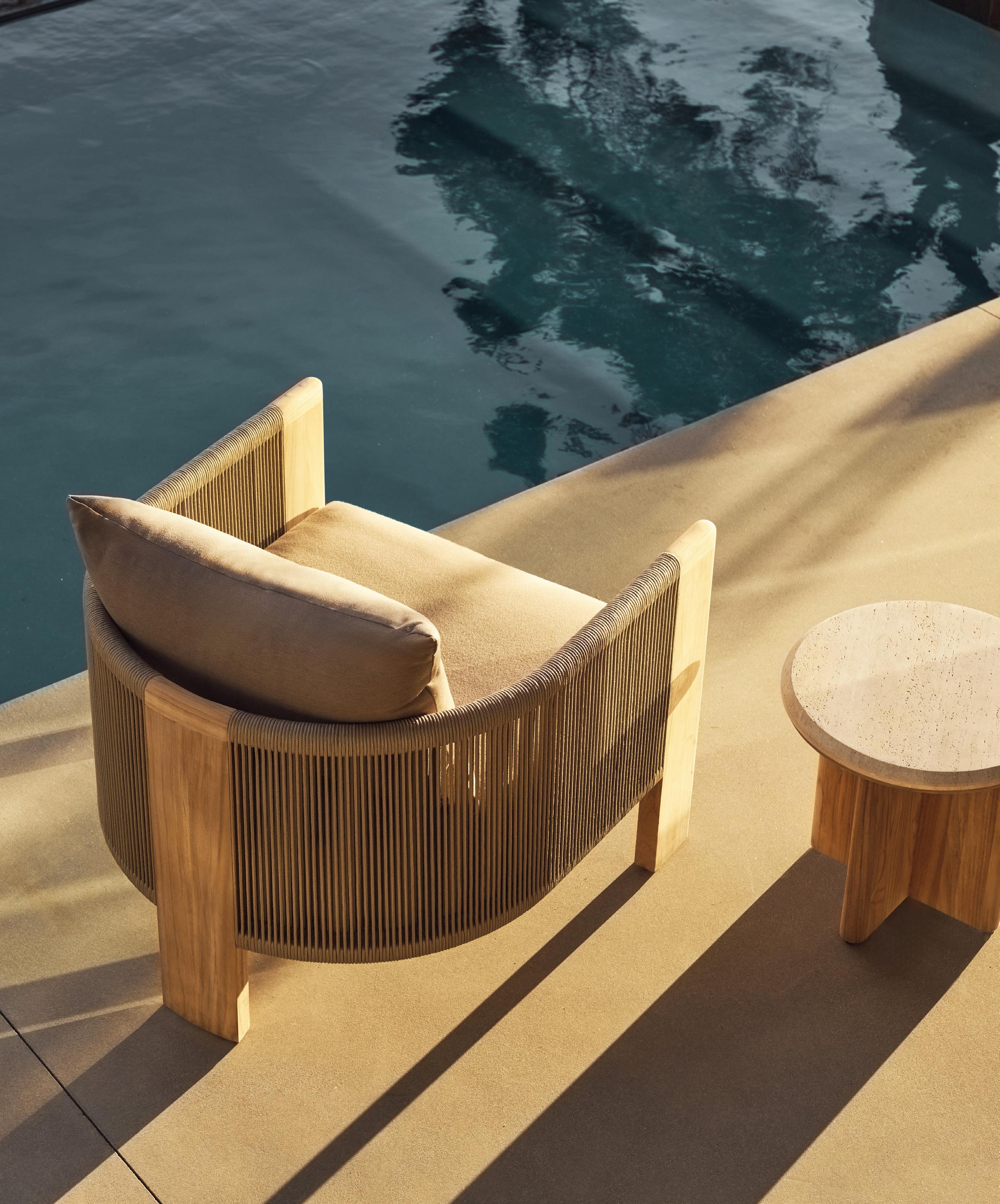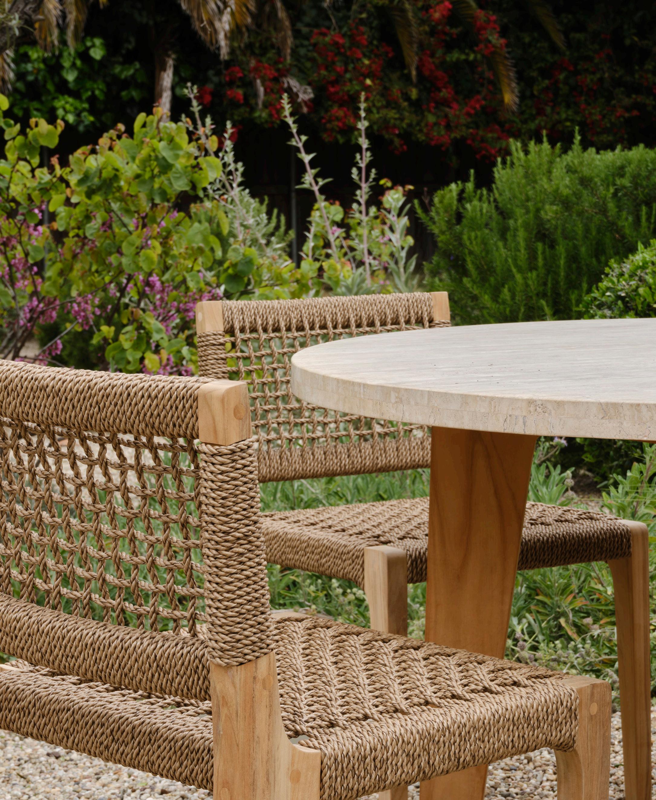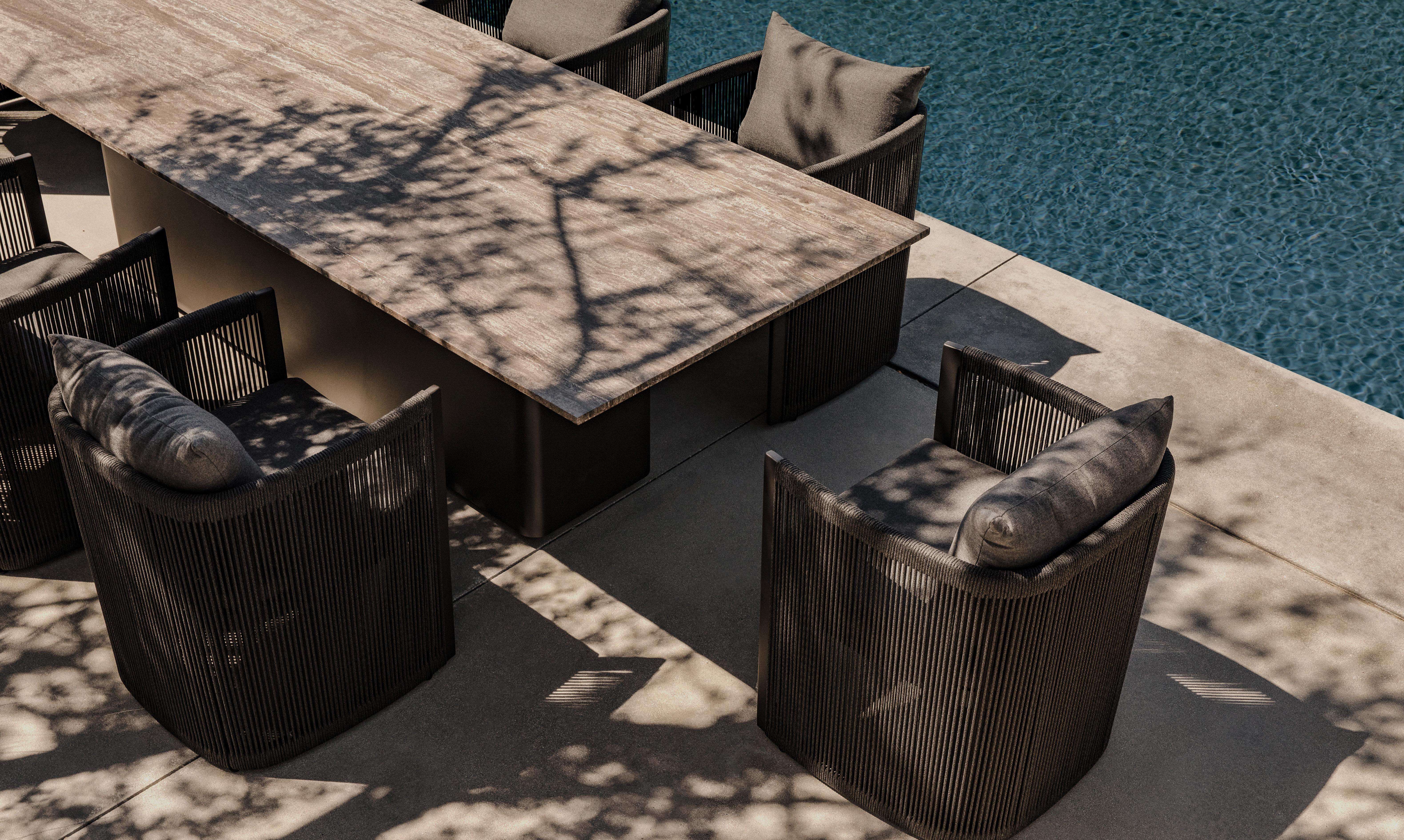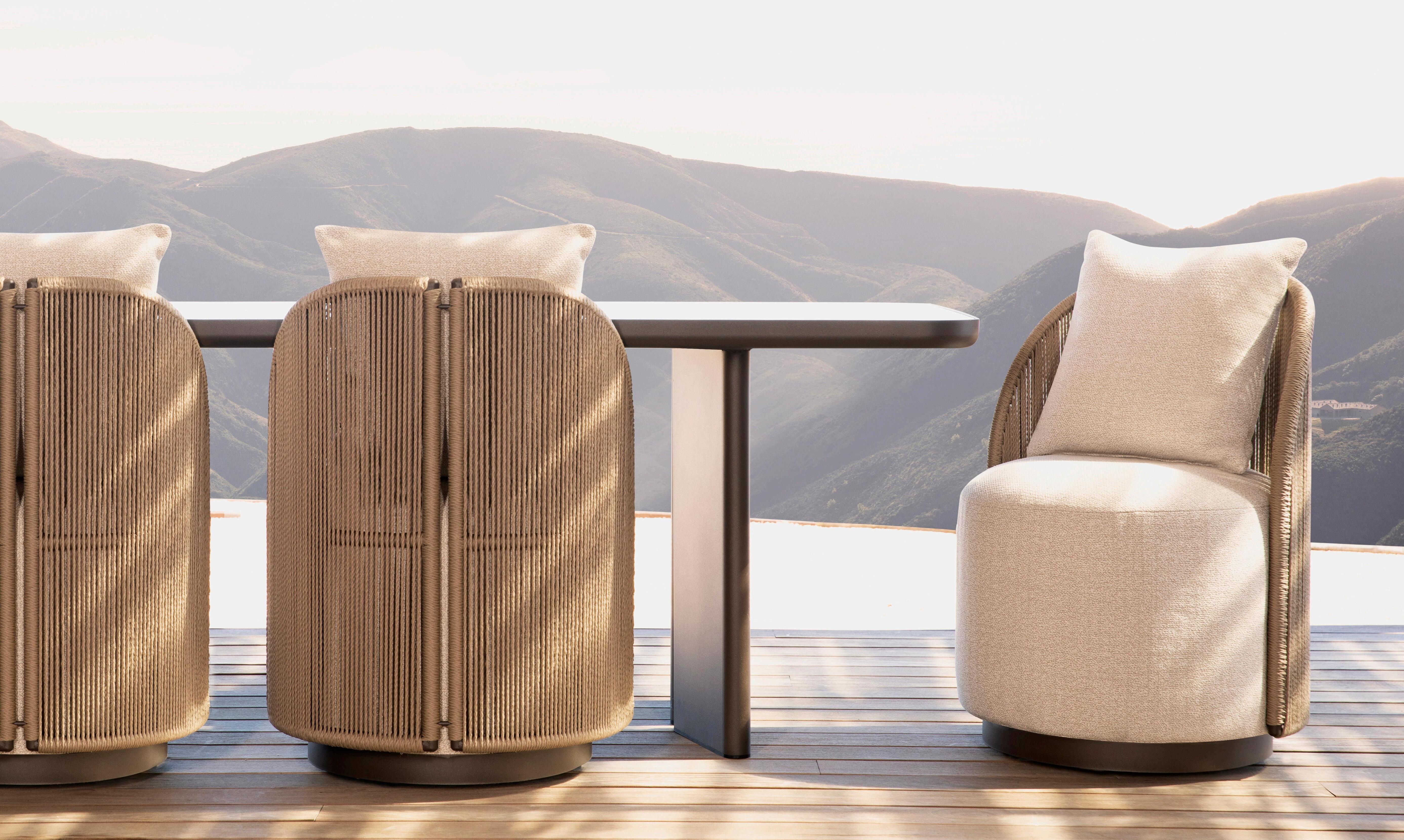 A nod to Sydney’s iconic Palm Beach with its stately coastal pines. Rounded backs, vertical rope detailing and a harmonious mix of materials infuse classic silhouettes with modern elegance.