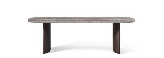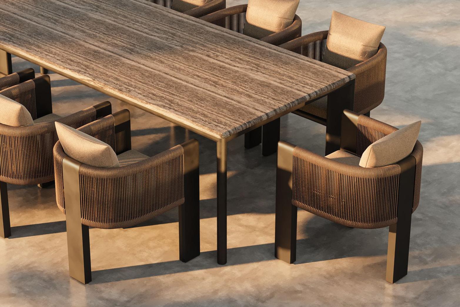 B. Parker Dining Table Shown in Aluminum Bronze Base and Travertine Grey Top.