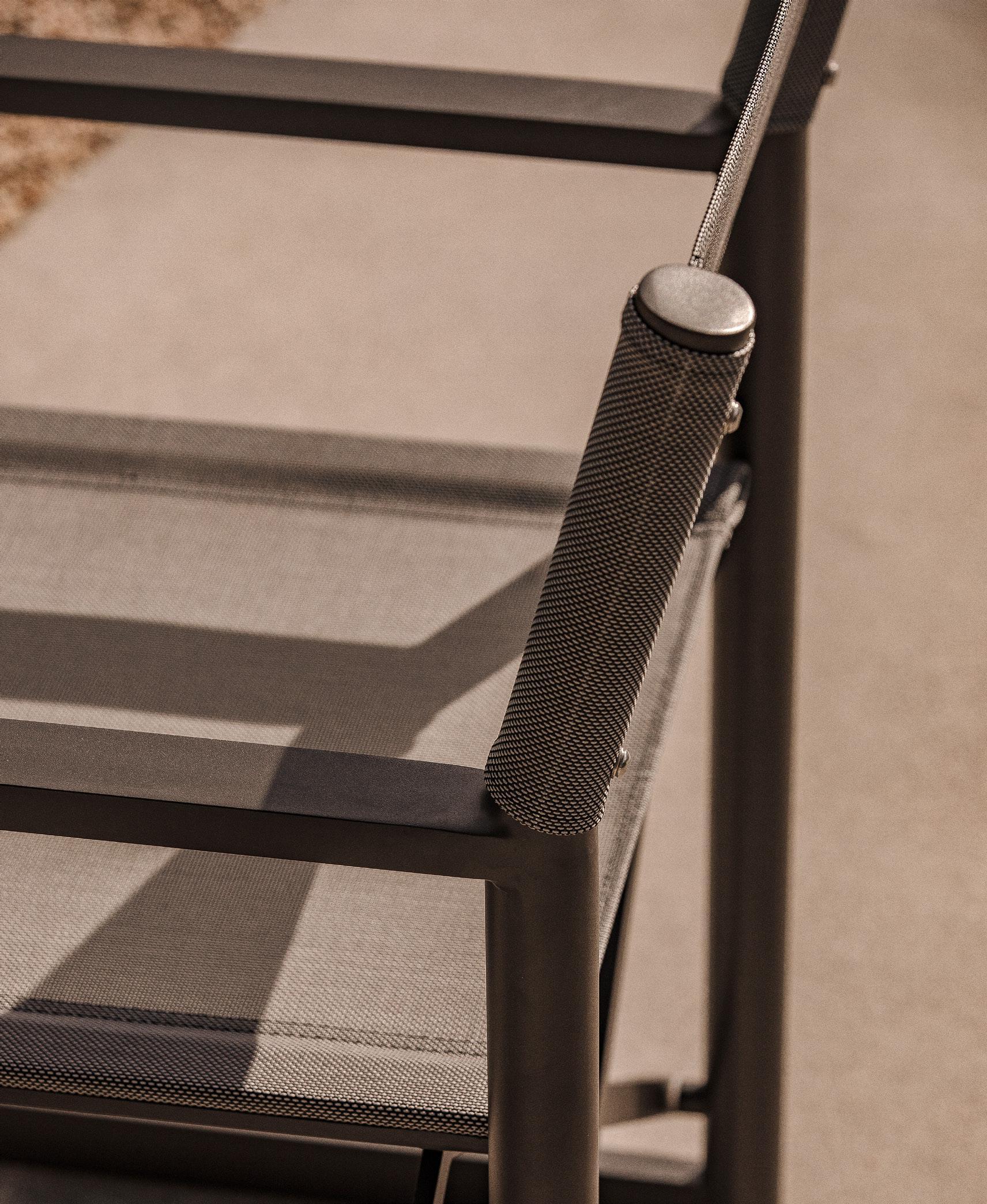 Shown in Aluminum Bronze Frame, Fossil Strapping and Riviera Stone Fabric with