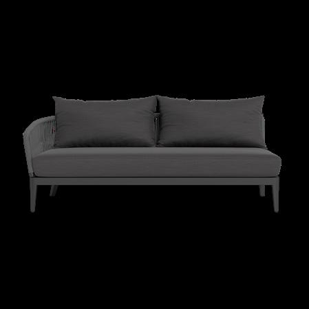 B. Parker 2 Seat 1 Arm Sofa Shown in Aluminum Bronze Frame, Fossil Strapping and Riviera Stone Fabric with Panama Coco Piping.