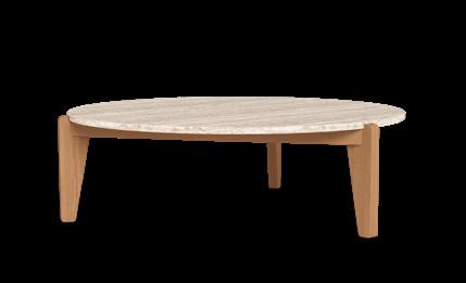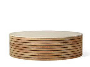 B. Catalina Co ee Table Shown in Teak Natural Base with Travertine Cream Top.