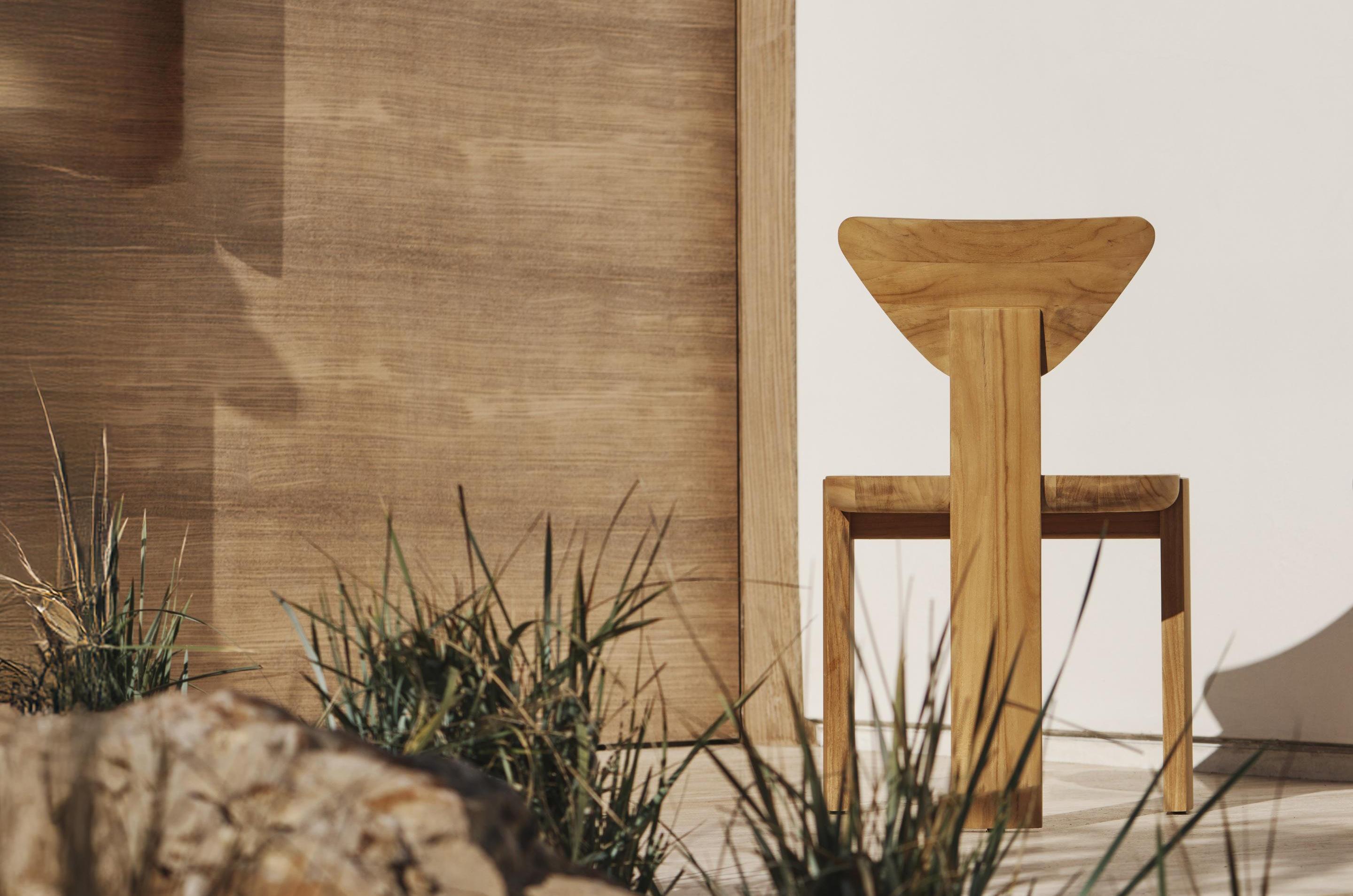 A simple tripod silhouette supports contoured seats in Indonesian teak for a versatile contemporary upgrade to outdoor entertaining.