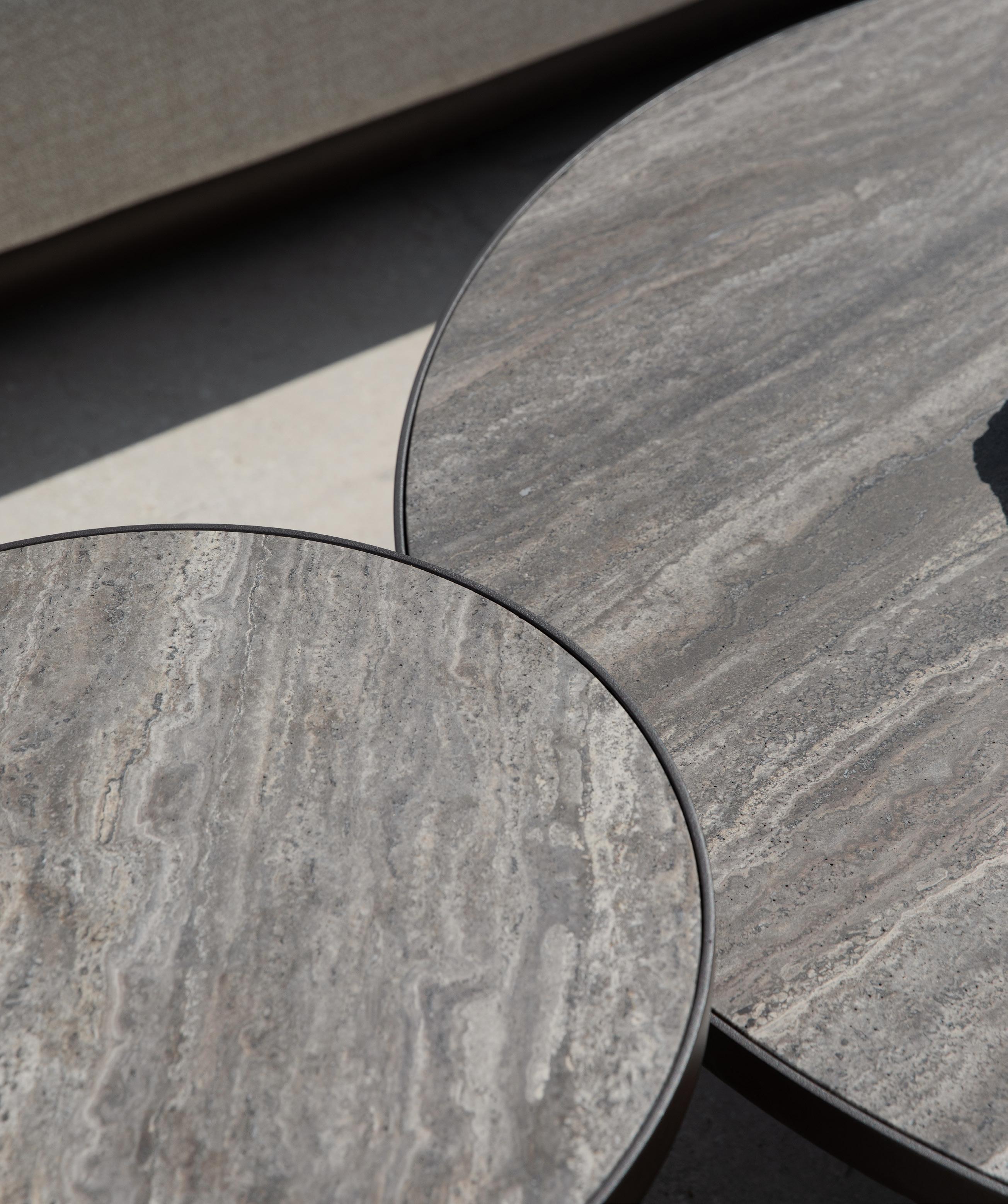 B. Andre Round Side Table Shown in Aluminum Bronze Base and Travertine Grey Top.