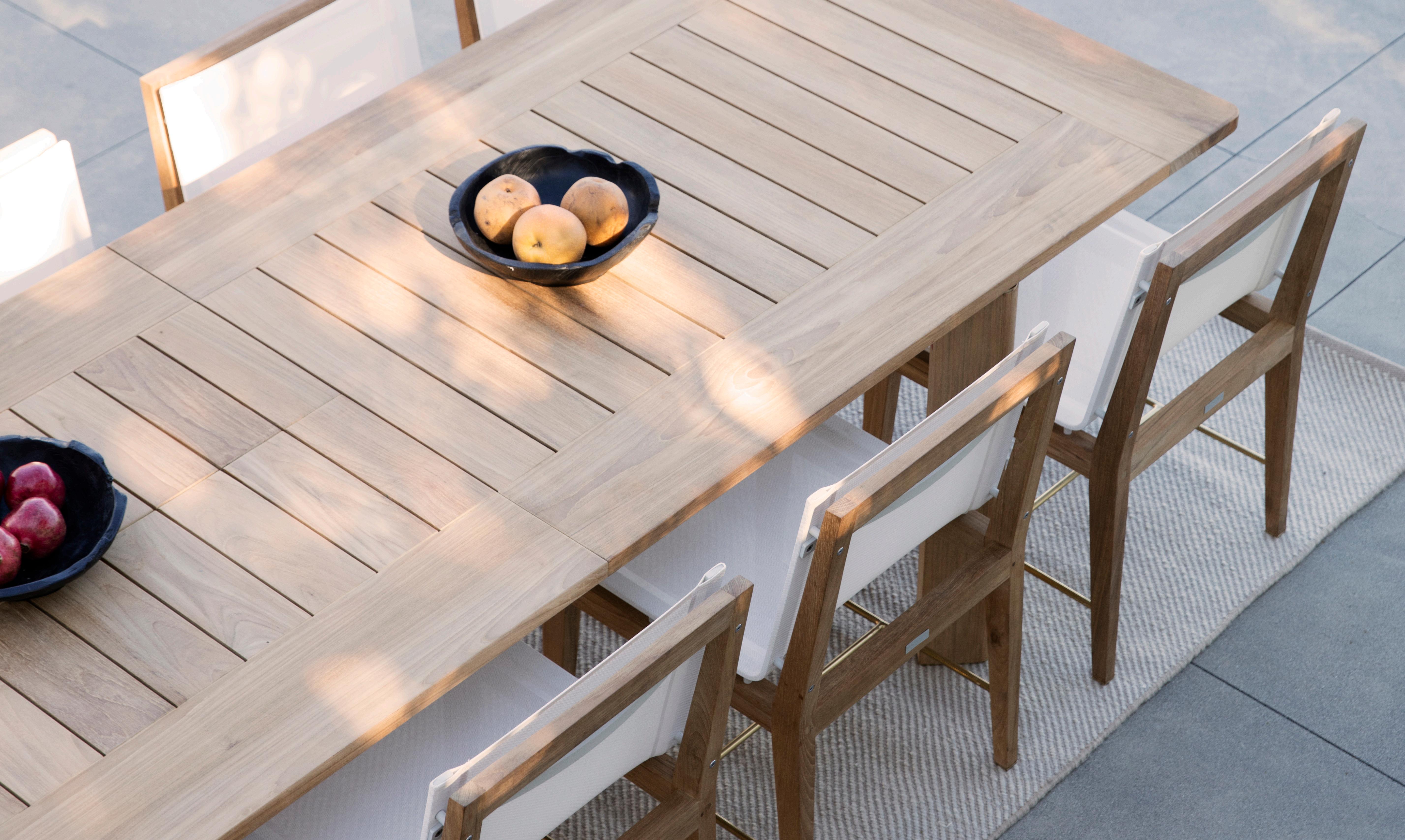 B. Byron Teak Dining Table Shown in Teak Natural Frame with Brass Accents.