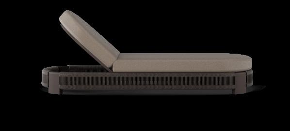 Shown in Aluminum Bronze Frame, Fossil Strapping and Riviera Stone Fabric with Panama Coco Piping.