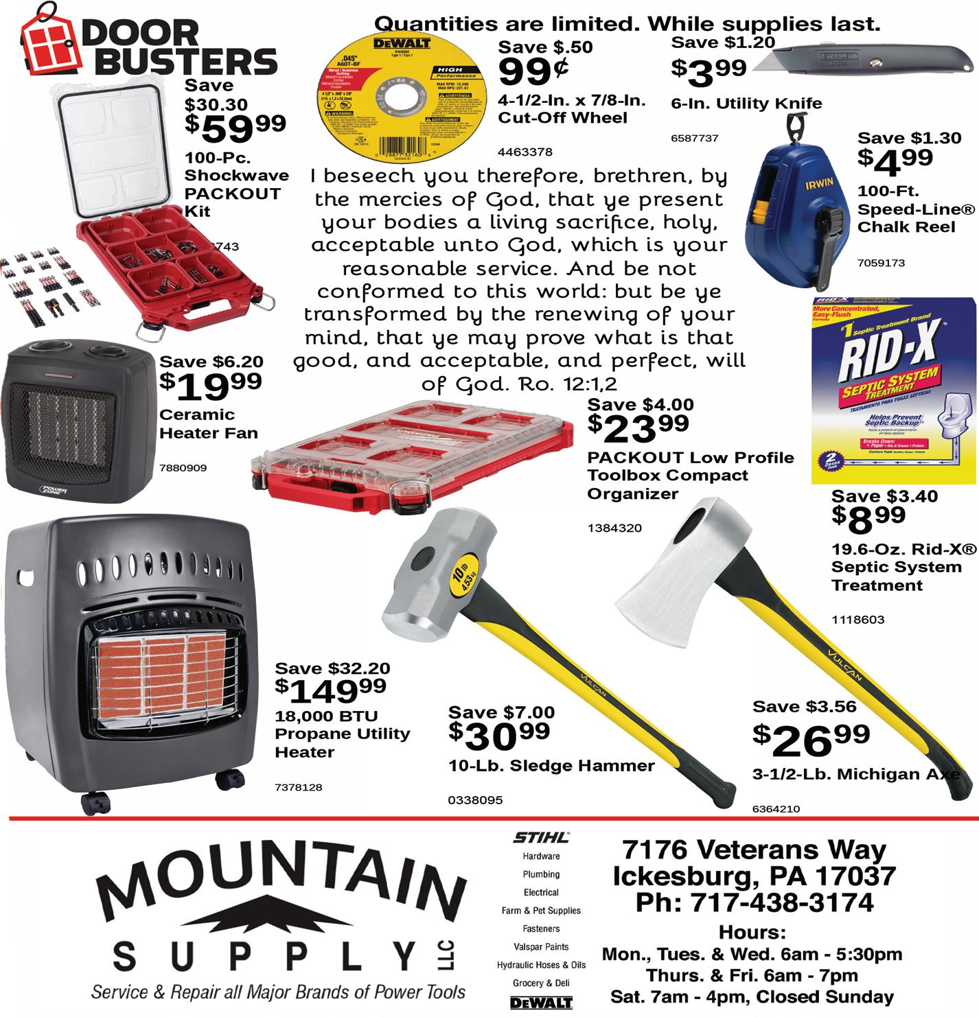 We at ROBINSON’S BARGAIN STORE in Loysville are thankful for all the customers. We have For Sale: Stop Leak, hand soap, Funnels, repair tape, water line anti freeze, fax machine, ice scraper, gloves, steering wheel covers, doors, seat covers, lamps, table covers, hand tools, hand saw, Royal hand vacuum, plastic bride sets and more great things.