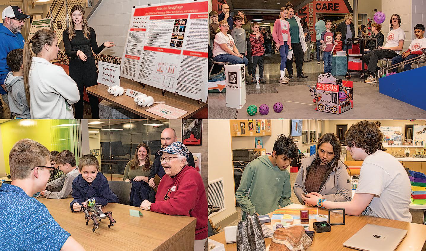 their in-depth, independent STEAM research projects. The STEAM Showcase helps students prepare for the North Museum Science and Engineering Fair (NMSEF), which is a regional-level science fair. “STEAM night really helped me prepare for NMSEF, and I loved talking with the public about my project,” said Ansh Dwivedi, Grand Champion of NMSEF 2025. Shown clockwise, from top left, is senior Emily Stauffer as she explains her science project titled “Rats on Roughage”; next, a robotic demonstration by ninth grader Emerson Evans, along with sixth grader Liam Patel and on the far left seated is their teacher Jenna Brower; next, tenth grader Dante Taraborrelli talks about rocks and geology; and finally, eleventh grade student Travis Stuckey captures the interest of first grader Easton Taylor with a robot dog, while his mother Brittany Taylor watches from behind. Ansh Dwivedi qualified