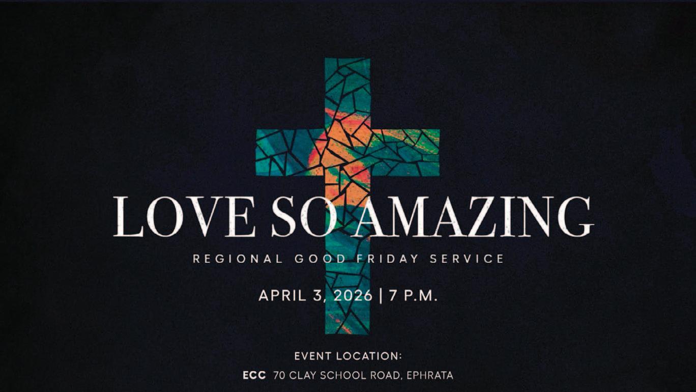 The Sunday, March 29 and Sunday, April 5 services will be ‘live streamed’ for those of you wanting a morning service at home on their website https://ephratafirst. org/, on YouTube at https:// www.youtube.com/@ ephratafirstchurch9278 (click on LIVE) and on Facebook at facebook.com/ FirstChurchEphrata (click on MORE, LIVE). They also have TV coverage of their 8:30 a.m. service on Blue Ridge Cable Channel 11 at 12:00 (Sunday noon). If you miss a sermon, they are archived and can be found on any of the above sites. Any questions, please call 717-738-2465.