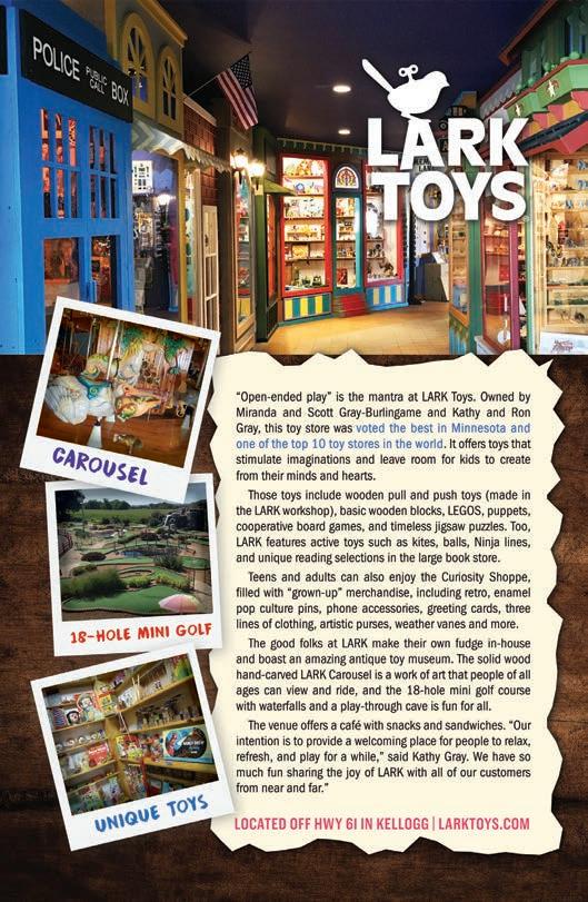 LARK makes their own fudge in-house and boast an amazing antique toy museum. The solid wood hand-carved LARK Carousel is a work of art that people of all ages can view and ride, and the 18-hole mini golf course with waterfalls and a play-through cave is fun for all. 507-767-3387, larktoys. com, 63604 170th Ave.