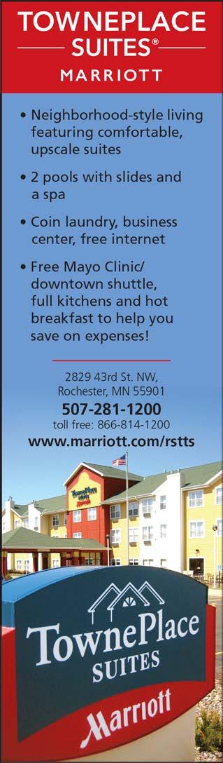 Free Hot Breakfast • Free WiFi • Guest Laundry • Business Center Free Mayo Clinic/St. Mary’s Shuttle, Suites consist of Full-Size Fridge, Recliner, Sofa Sleeper, and Two TV’s • Plus Suites 450 sq.ft. Living Room and Bedroom Separated by Door