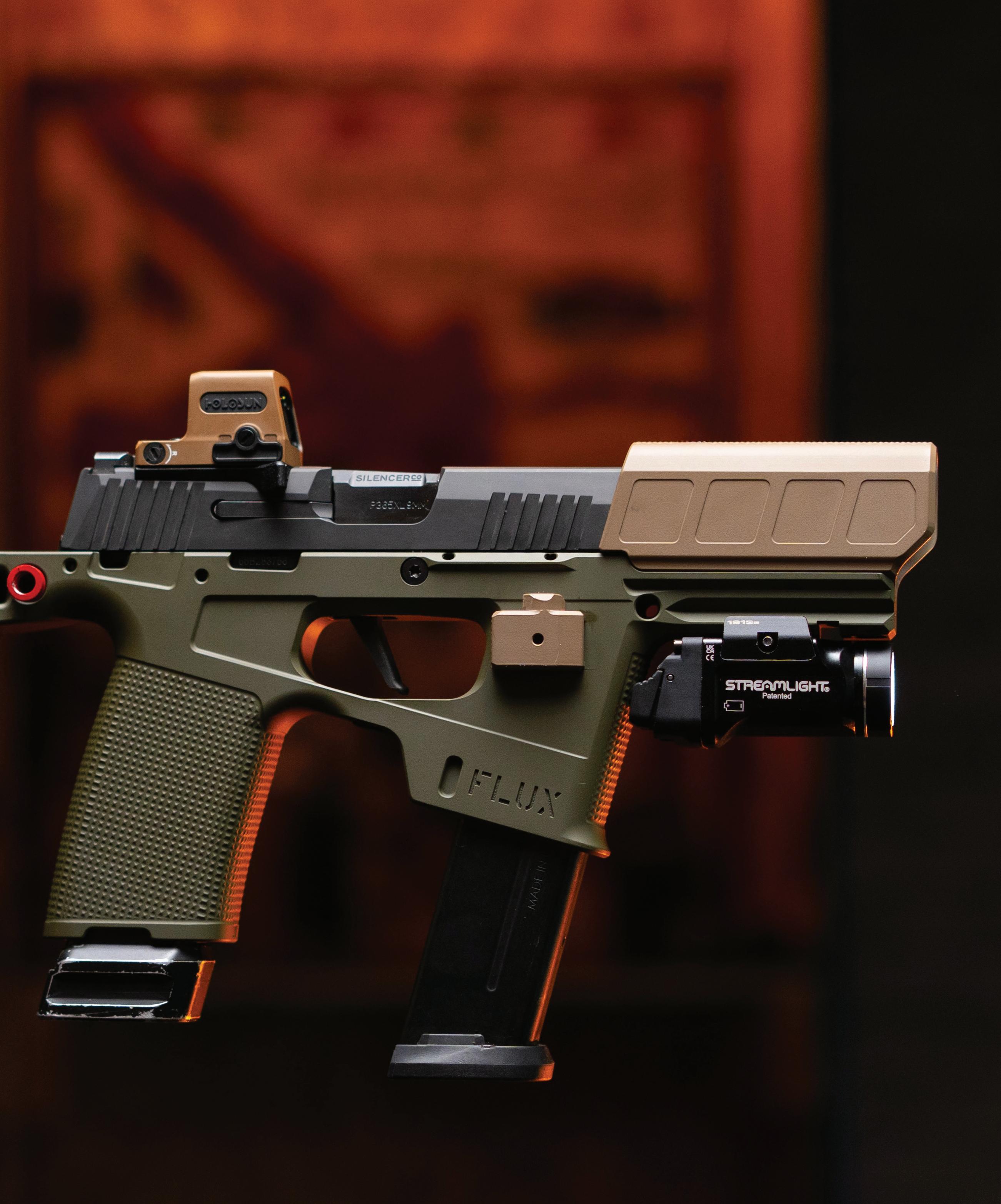 Flux Defense’s (Booth #75124) most popular design, tailored for the same pistol, was released in 2024. “Our Raider 365 chassis for the SIG SAUER P365 was designed on the principle that a stocked or braced pistol should really not be any larger than its host pistol itself,” says Alex Aubrey, chief marketing officer for Flux Defense/Snakestaff Systems/ Antimatter Industries. “Keeping functionality at the forefront resonates with people who shoot a lot and take self-defense seriously.” Available accessories include a forward optic mount, side-folding brace, and more.
