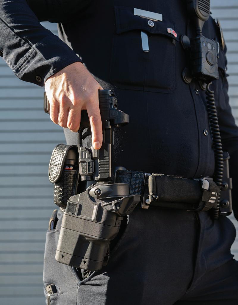 With a minimalist footprint, the Ballast holster maximizes duty belt efficiency, allowing patrol officers to carry full-sized firearms without sacrificing belt space. An internalized ALS lever-lock spring shields Ballast’s core security mechanism; the textured ALS lever also allows for improved thumb contact and ergonomics. For added versatility, a redesigned cantable UBL belt mount supports 15-degree forward or rearward angles or vertical alignment for maximum comfort and an efficient draw stroke.