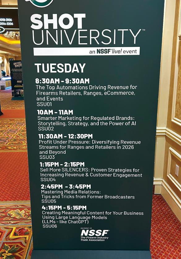 ADVERTISING: Advertising inquiries should be emailed to shotbusiness@colepublishing.com. No responsibility will be assumed for unsolicited materials. SHOT BUSINESS is a registered trademark of NSSF. Contents copyright ©2026 by NSSF. All rights reserved. Reproduction in whole or part is prohibited unless expressly authorized by publisher.
