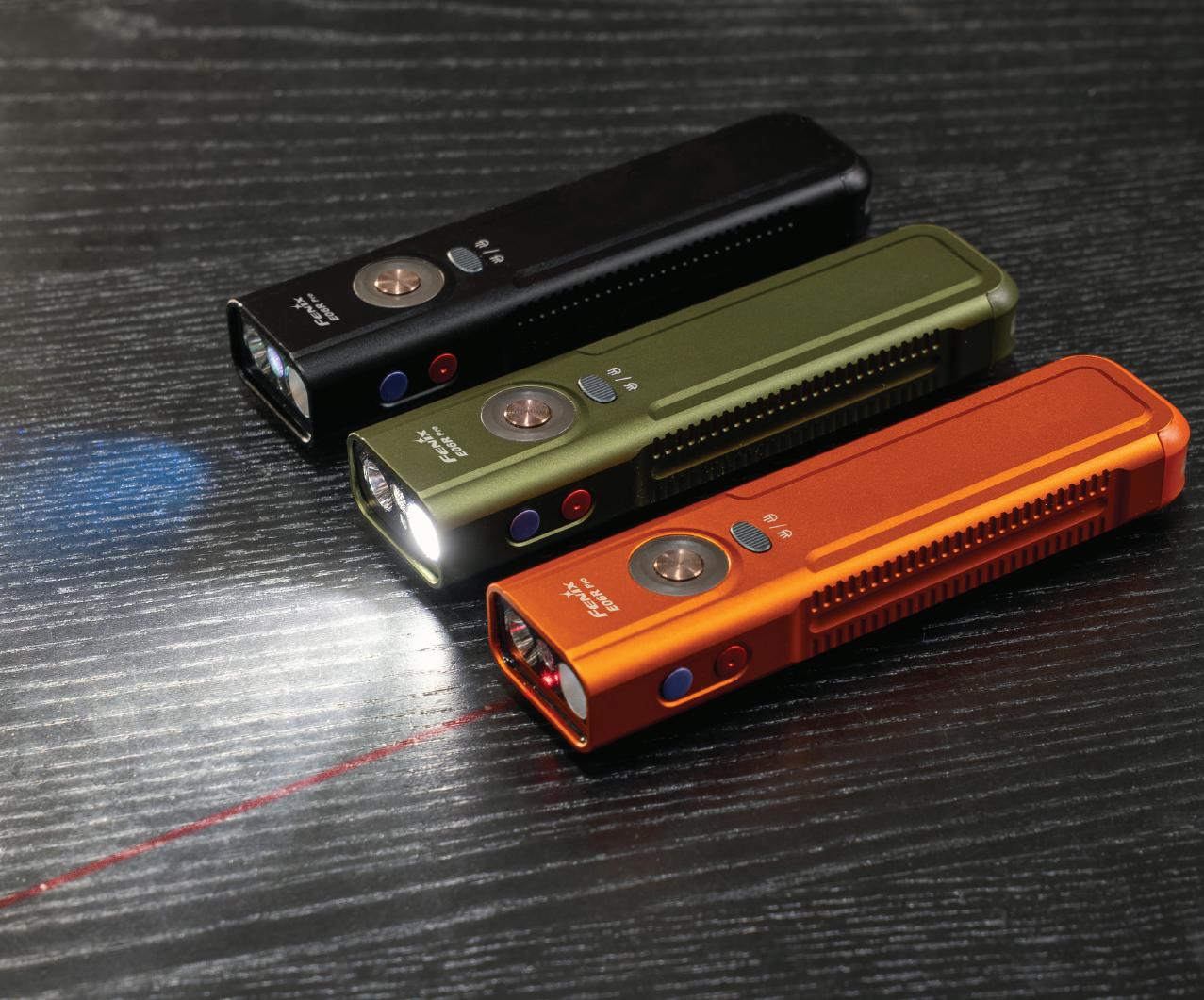 The spot and flood beams of the E06R PRO Flat Flashlight can combine to unleash a 1,600-lumen Instant Turbo, giving you the power you need at a moment’s notice. It also offers intuitive control through either the independent tail switch or the side switch, all in a sleek, flat-bodied design. Along with five brightness levels for each spotlight and floodlight, it includes a UV light, red laser, strobe, Instant Turbo, and Scene Mode that enables flashing or full-spectrum color on both the ring and tail. Built tough and USB-C rechargeable, the light is available in three colors: black, orange, and OD green.