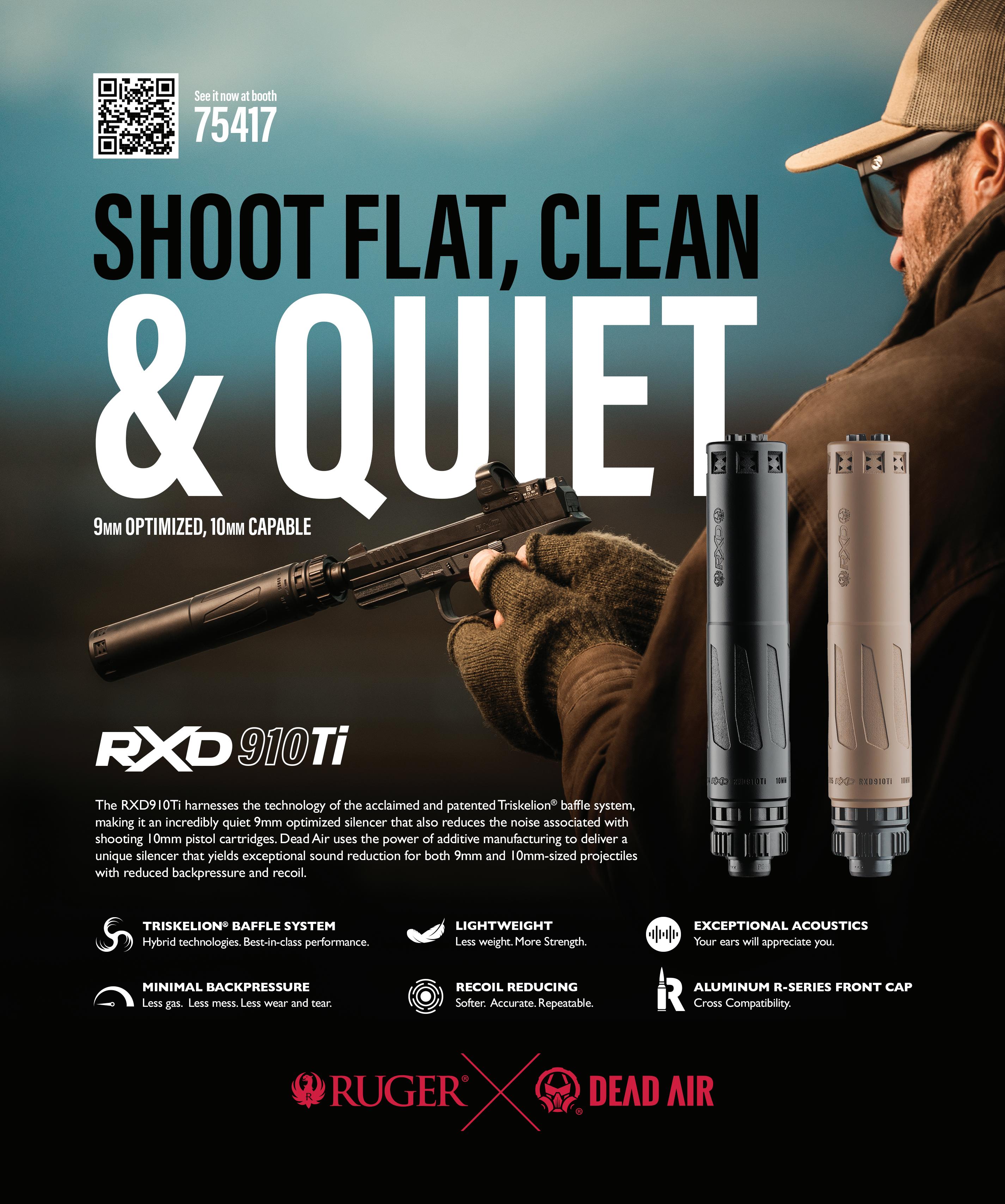 The RXD910Ti is the third advanced suppressor designed and manufactured by Dead Air Silencers under license from Sturm, Ruger & Co., Inc. to compliment Ruger’s innovative firearm designs. Dead Air developed this suppressor specifically to optimize performance for 9mm applications while also delivering enhanced sound suppression in 10mm pistol applications.
