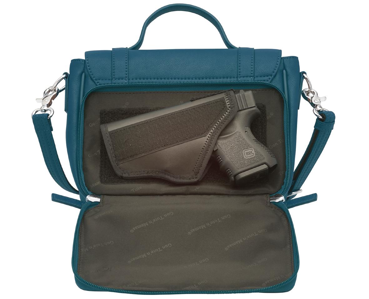 he new Avenue Large Satchel from Gun Tote’n Mamas (GTM) is here. The concealed-carry purse features an outside front pocket with a flap-over metal toggle-clasp closure that has a RFIDprotected front panel that can accommodate most phones. There is also a pair of fully lined exterior compartments with additional open and zipper interior pockets that can hold a wallet, keys, glasses, and other small items such as pepper spray and a knife.
