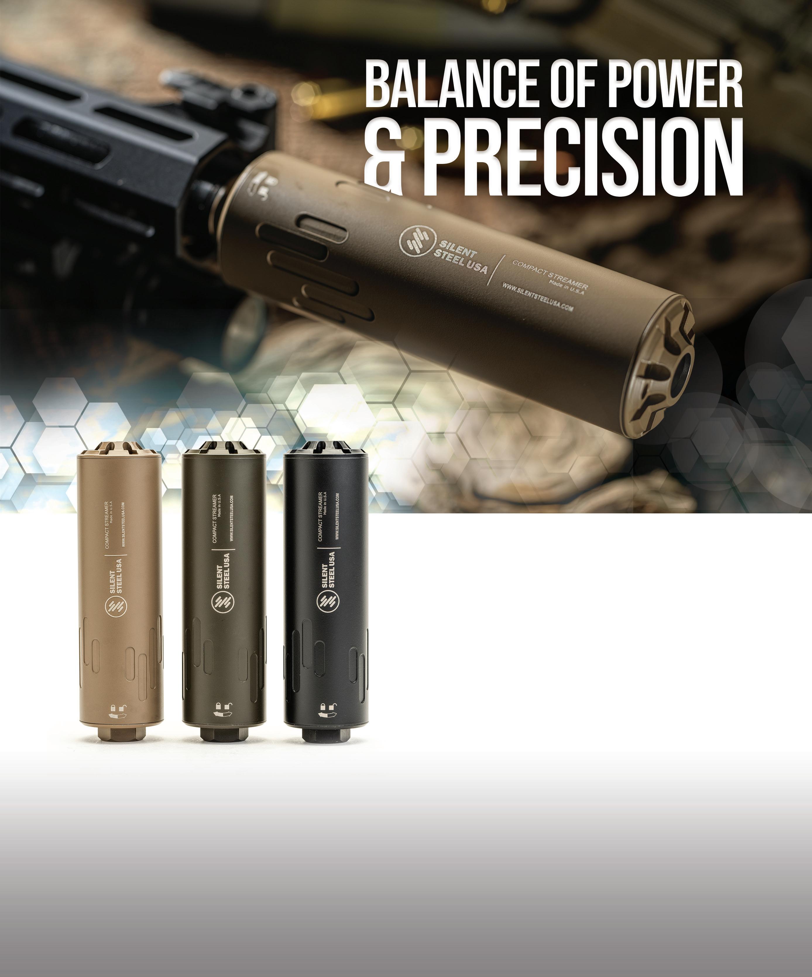 Don’t let the small size fool you; the Silent Steel USA Compact Streamer packs full-size performance into a shorter, more maneuverable form. Featuring the same advanced FLOW-IQ technology as the full-size model, it effectively reduces blowback and recoil while keeping your rifle balanced and agile. Ideal for shooters who demand suppression, the Compact Streamer delivers low-gas, low-signature performance in a lightweight, rugged, and easy-to-maintain package. The Compact Streamer comes with either an aluminum or a stainless-steel body. The aluminum body is suitable for PCC carbines and hunting/target rifles. The stainless-steel body with the flow-suppression unit is full-auto rated. Available calibers are 5.56, 7.62, and 9mm. SRP: $1,299.