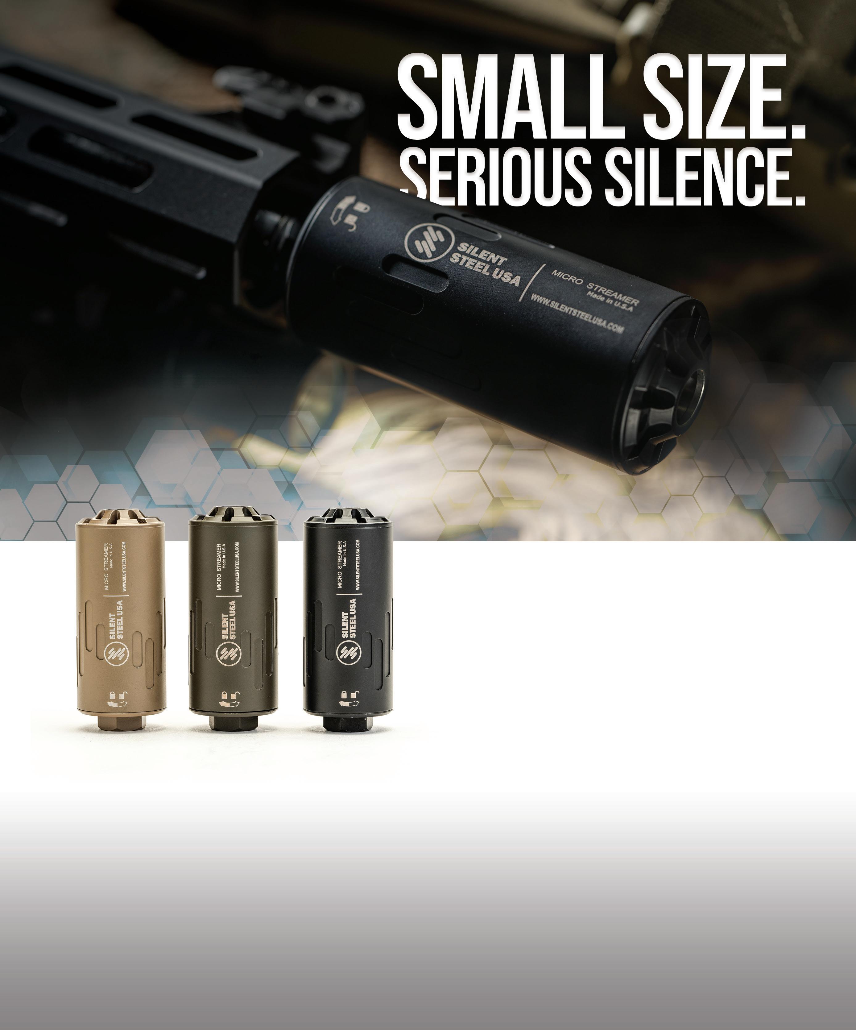 The Silent Steel USA Streamer is a next-generation FLOW-IQ technology suppressor, purpose-built to reduce gas blowback while maintaining exceptional sound suppression. Its innovative design directs gas forward, improving shooter comfort, especially on semi-automatic platforms and reducing wear on critical components. Lightweight, modular, and easy to clean, the Streamer combines rugged performance with advanced engineering, making it the ideal suppressor for modern tactical and recreational shooters alike. Suitable for precision shooting as well as full-auto rifle use. Available in 5.56, 7.62, and 9mm versions. SRP: $1,499.