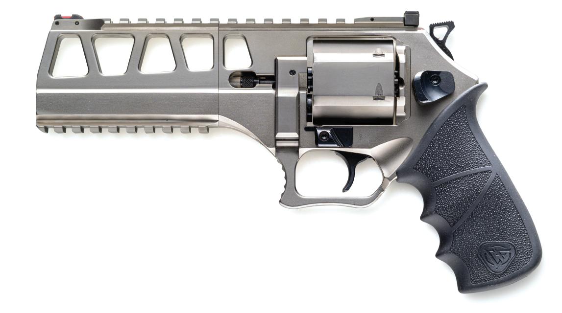 Despite the larger chambering, the frame maintains Chiappa’s characteristic balance between strength and weight using a 7075-T6 aluminum frame paired with a steel barrel and breech shield.