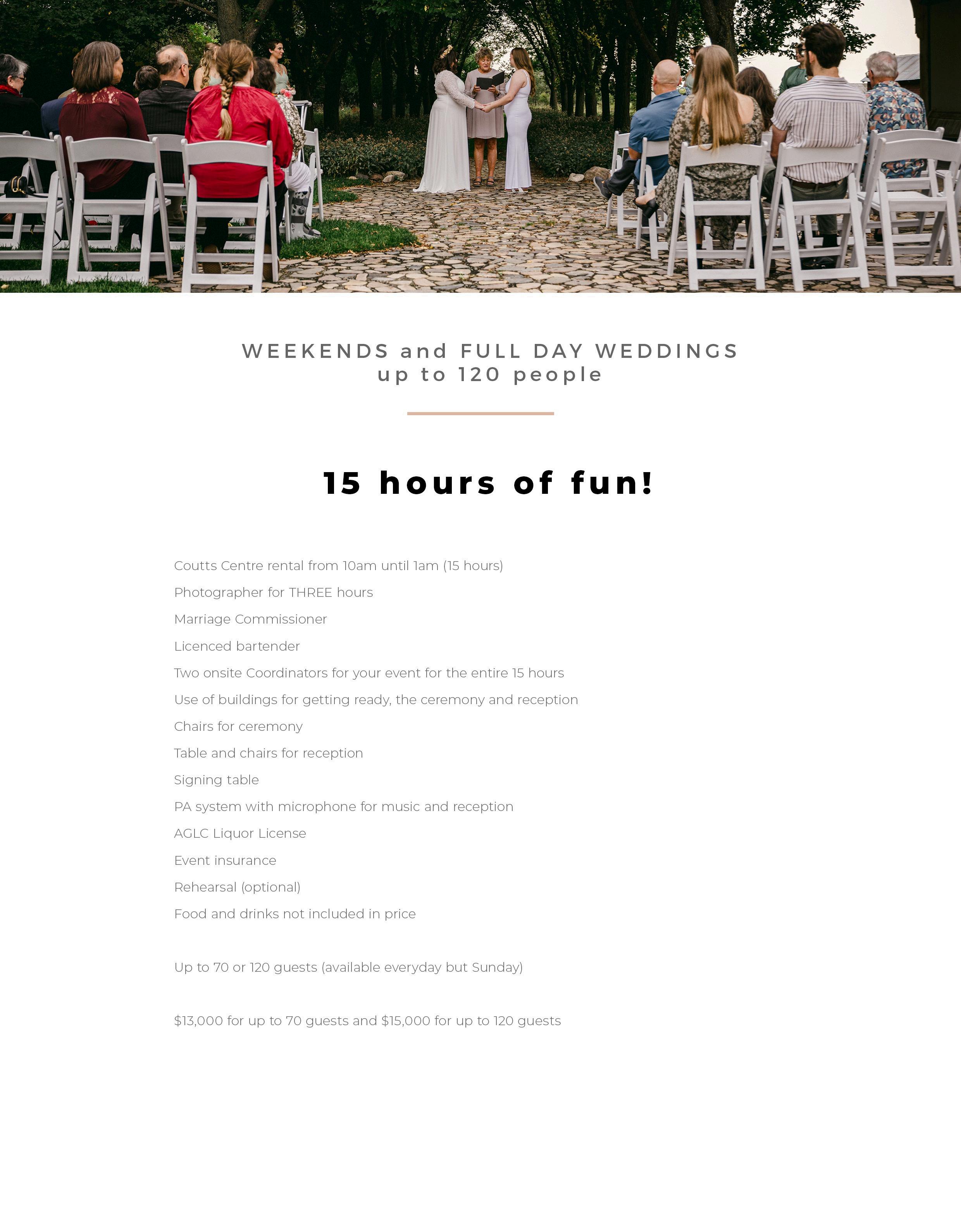 With two packages to choose fro m, you can have a small two-hour wedd 1 ng or a m ore extensive five-hour exper i ence that includes a reception and dr inks on top of your ceremonY an d photos Food and a I cohol are not included in the pac kage pri ces, but can be added on