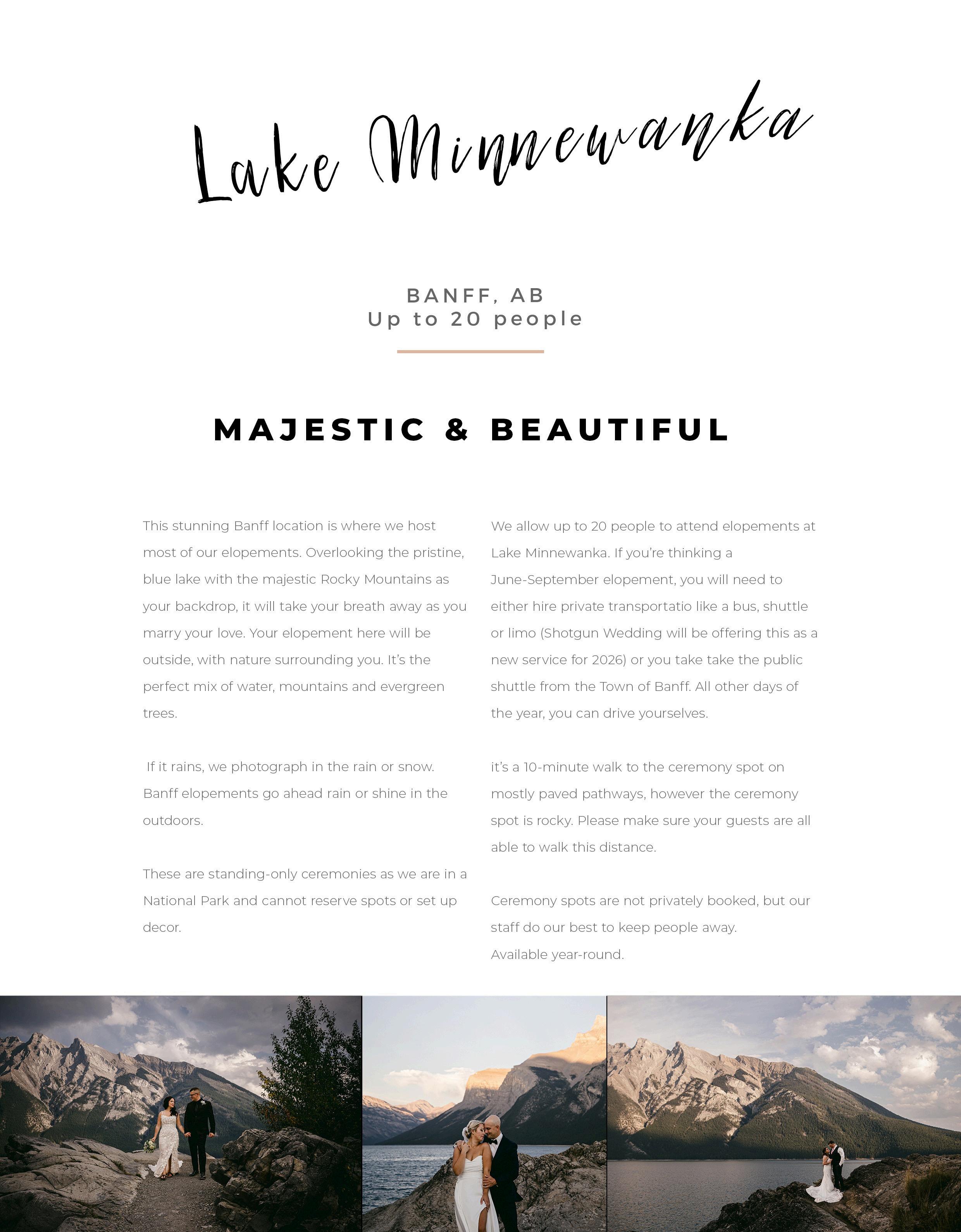 Mountain Park Transportation, Banff Airporter, Alpine Limo and Highland VIP New for 2026, Shotgun Wedding will be offering shuttle services for up to 14 guests to Moraine Lake, Quarry Lake and Lake Minnewanka Details to come in the new year