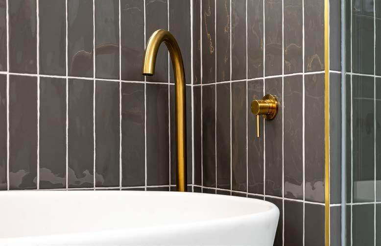 The brushed brass tap-ware is a main feature that provides a touch of class and sophistication, the perfect contrast against the Carrara marble tiles. Another stand-out feature is the beautiful charcoal coloured wall of stacked subway tiles that adds contrast without enclosing the space.