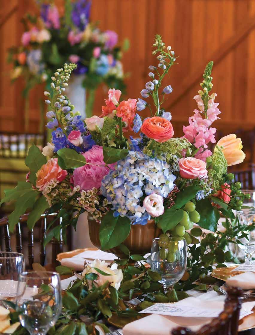 From the wedding reception of Chloe Harris & Hunter Corbett at Quail Branch Lodge featured in the “Real Weddings” section. Arrangement by Lynn Vallotton Floral Design. Photo by Wes Sewell Photography. 65