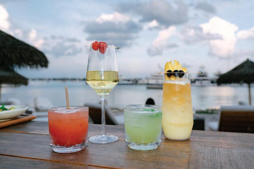 The completely outdoor social club has a “relaxed chic” atmosphere. Most of the dining room seating is under an oversized thatched-roof tiki bar, which offers unobstructed views of the marina. The open layout encourages movement between the pool deck, the toes-in-the-sand beachfront day beds, and