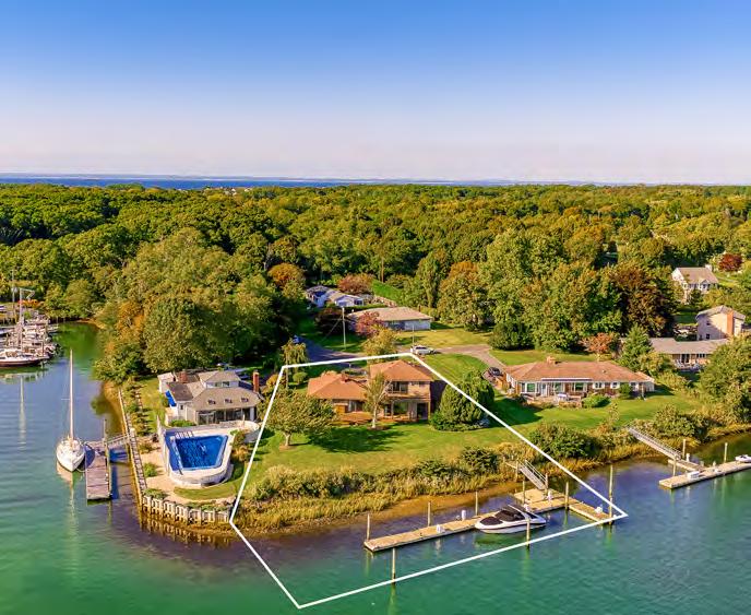 715 Dawn Drive, Greenport | $2,649,000 | 5 BR, 4 BA | Waterfront home with heated pool, deepwater dock, community bay beach and nearby golf course. Direct open views across Gull Pond to the bay beyond. Room for all with 5+ bedrooms, 4 full baths and a living room with fireplace. Primary suite with balcony. Fully finished lower level with wet bar, game room, den/office (with full size window), full bath and slider to pool. Marble baths, steam showers and Jacuzzi tubs. Radiant heat in several rooms. Web# 3457387