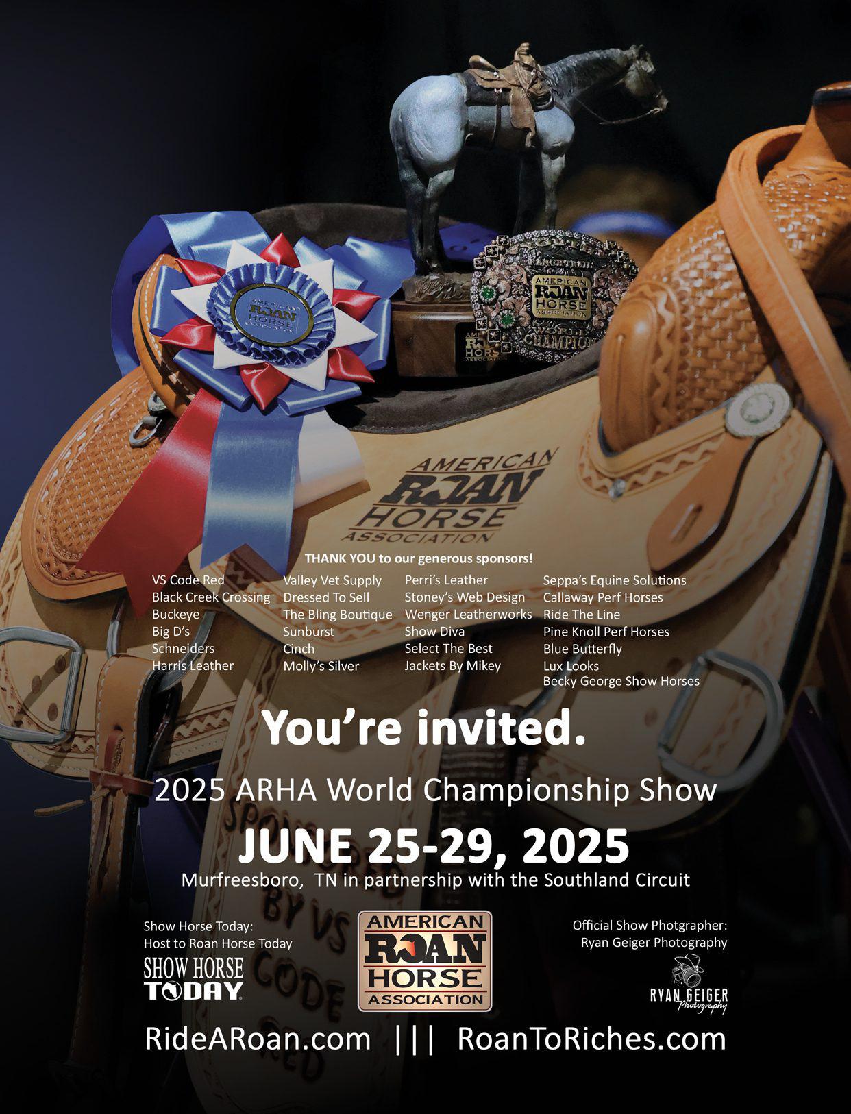 Show Horse Today is proud to be a major sponsor of the 2024 ARHA World Show and has long been a media partner for the association from its beginnings. Our hope is that the reach of PleasureHorse.com and Show Horse Today’s 54K Forum Members, 690K FB fans and nearly 1M views on the sites will bring many new faces to the American Roan Horse Association and its programs.