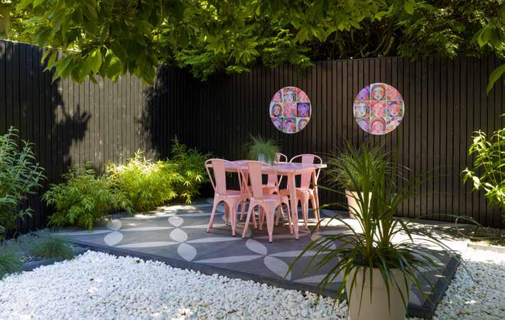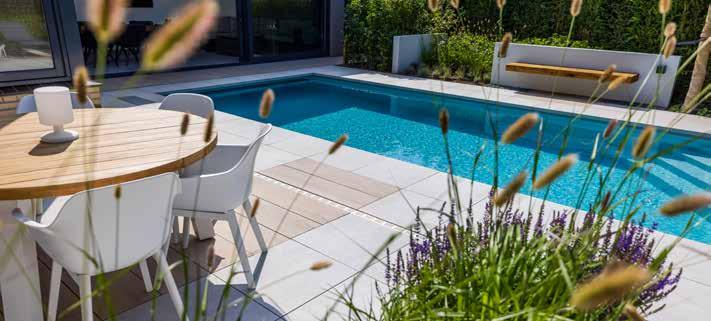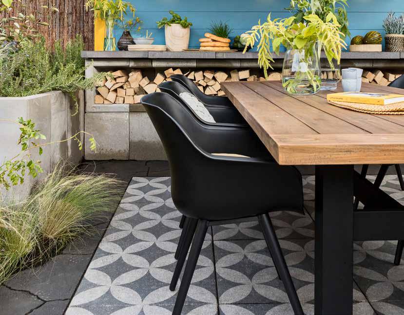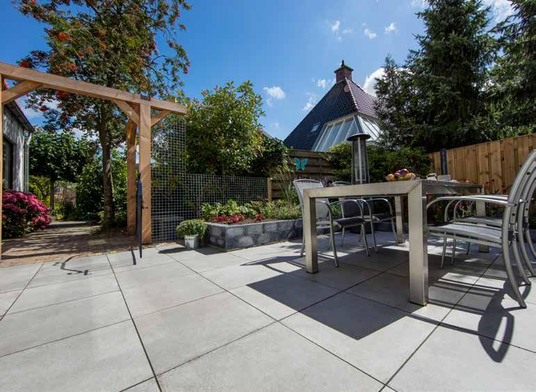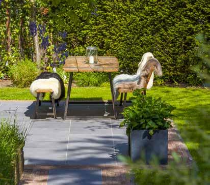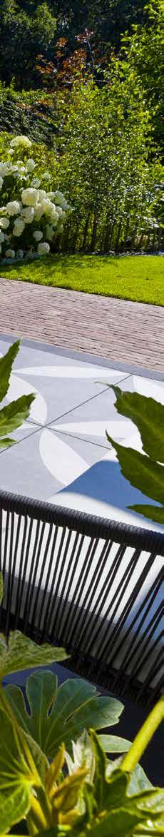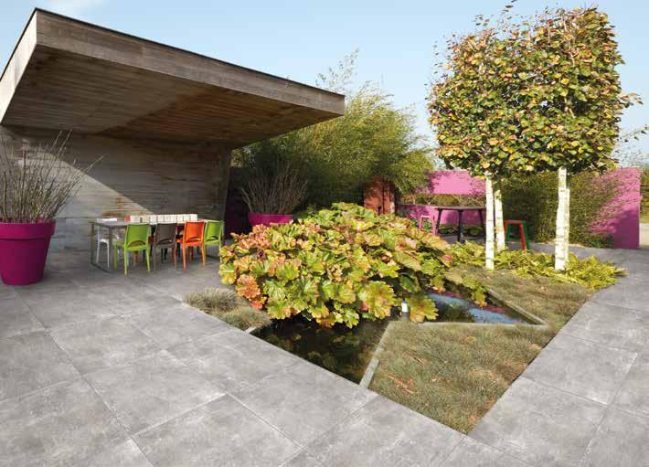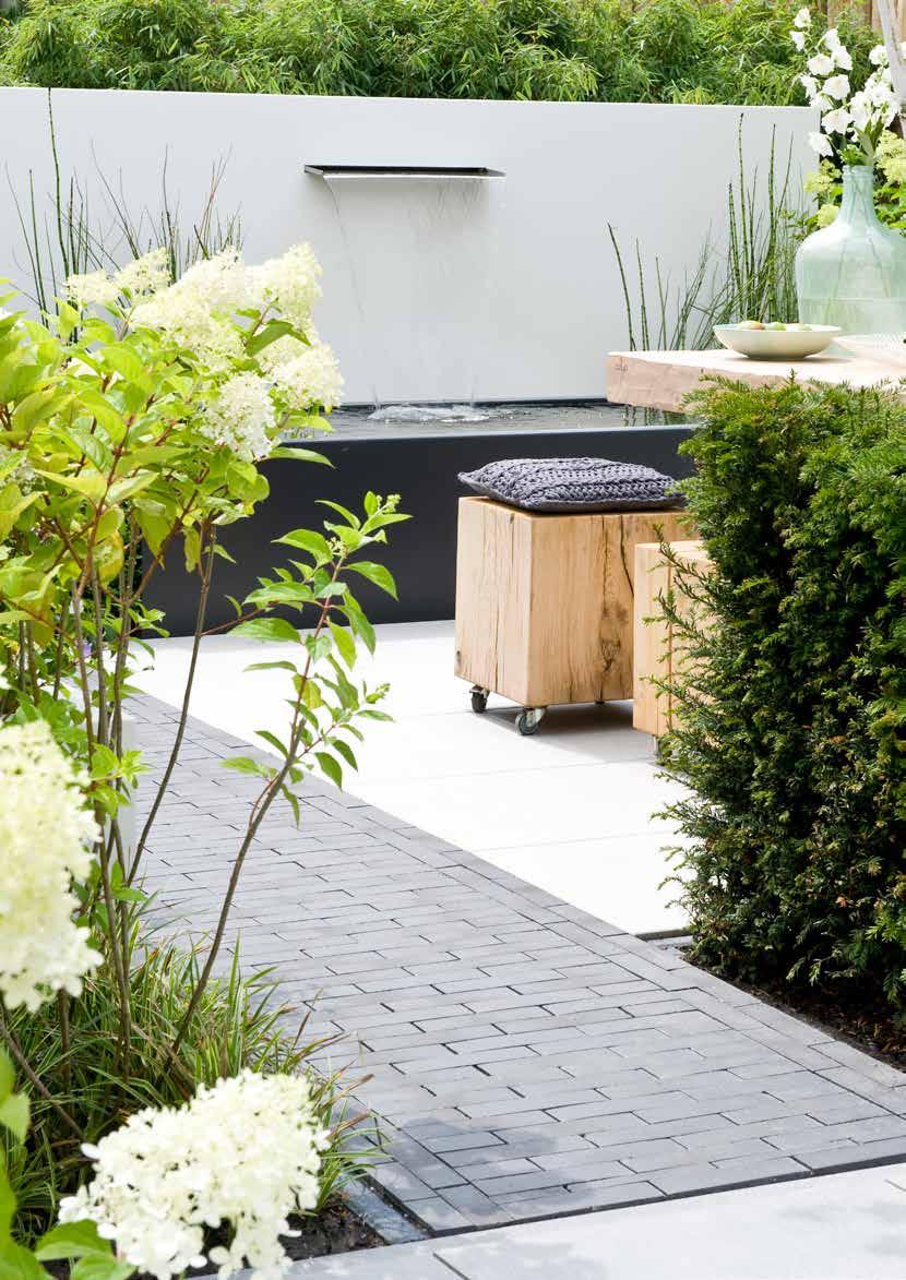 Gebruik grotere tegels om een ruimtelijk effect te krijgen in een kleine tuin. Een rand met kleinere stenen geeft een bijzonder mooi contrast. Contrast kan zich ook bevinden in materialen, kleuren en texturen. Zo kunt u bijvoorbeeld een combinatie maken met een keramische tegel en gebakken waaltjes.