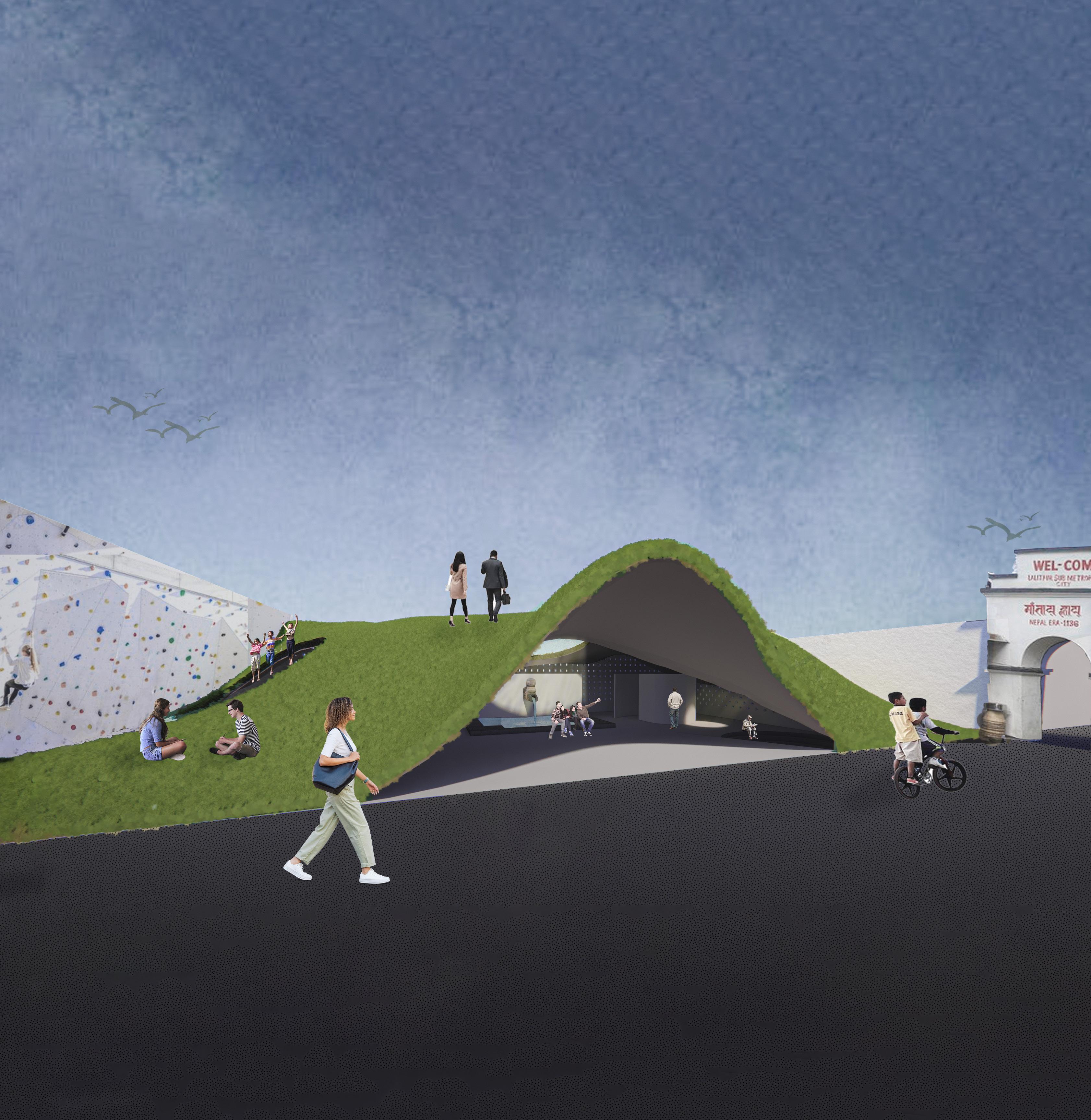 The essence of Paaila lies in offering a safe haven where contemporary relaxation converges with traditional Nepali elements, catering to a diverse age group. The design unfolds on multiple levels, featuring a green roof, a serene pond, and a rock-climbing space, a silent amphitheater, and a sukul seated area for playing age-old Nepali games. The focal point, "Dhunge Dhara," weaves the past into the contemporary fabric, encapsulating the emotions of the older generation.