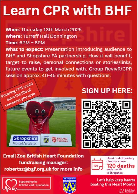 Zoe Roberts, Fundraising Manager for Black Country, Shropshire and Staffordshire at the British Heart Foundation (BHF) said: “We are honoured that Shropshire FA have chosen to support the British Heart Foundation and help fund the scientific breakthroughs of tomorrow.