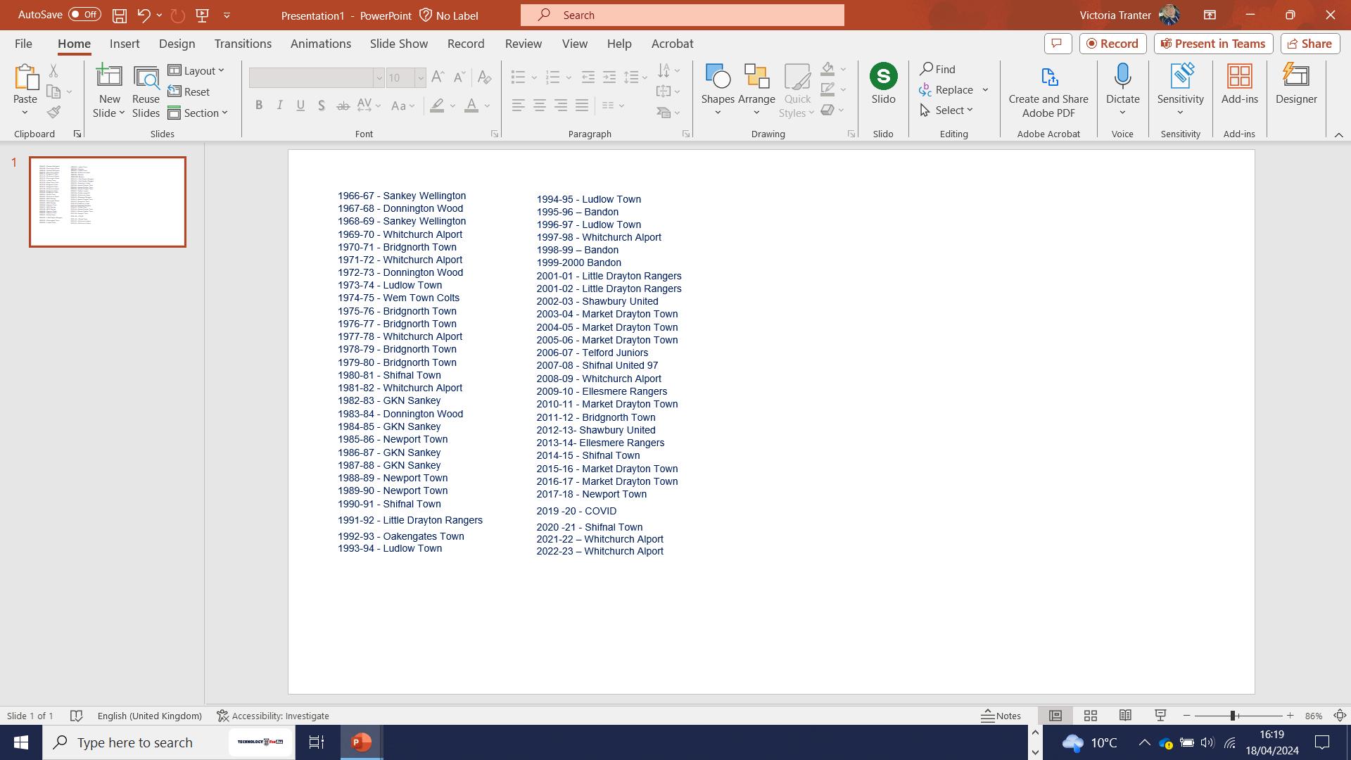 Town finished in 15th position in the league, which was rather disappointing as they fell away with a congested fixture list towards the end of the season. However, success in the League Cup competition at Walsall’s Banks Stadium against Coalville Town sweetened the pill somewhat!