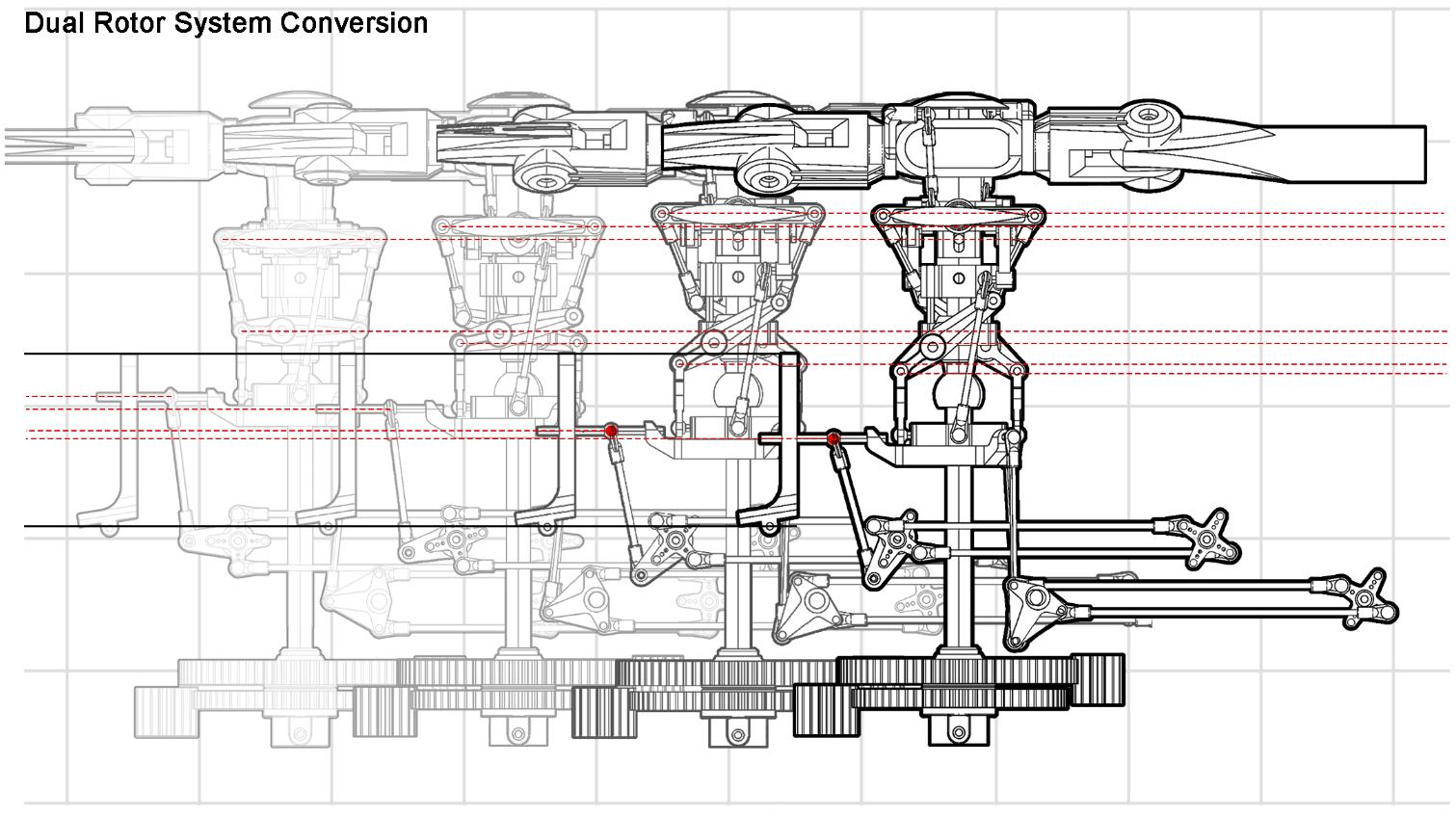 The two propeller rotation systems are crossconnected together to combine the steering system and interlocking system respectively to form the main structure.