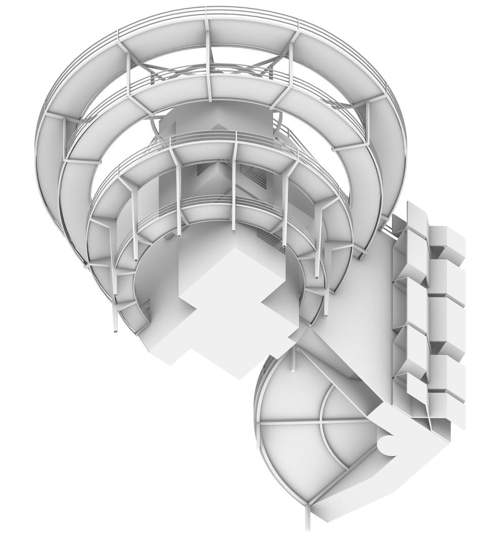 The roof space is open and the two main structures are joined together, with a transparent lookout space at the very top.
