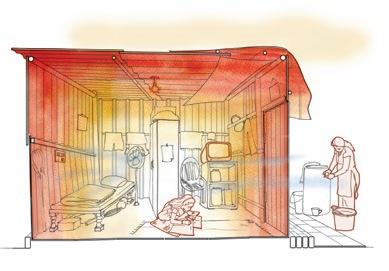 The graphics produced communicate the architecture and material quality of the construction to show their direct relation to heat gain. A watercolour wash is used to depict the heat signatures inside the building section. An important aspect of the project was the need to show the use, activities and people inside. This was done to show how these factors add another dimension to the experience of discomfort and health risks.