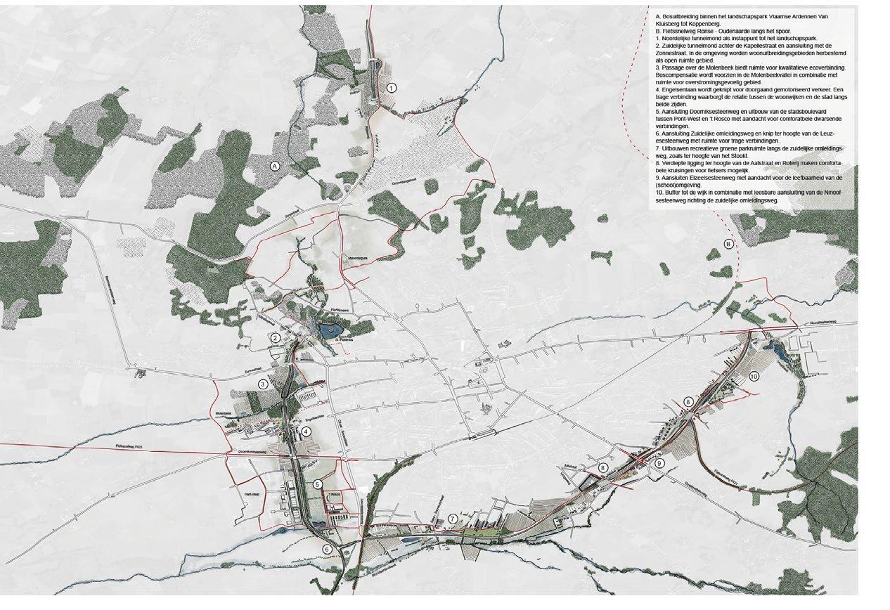 Rond Ronse is a road infrastructure project that creates a by-pass route for the city of Ronse. The team looked at the road as landscape itself that needs to be shaped keeping in mind the networks of ecology, soft mobility, noise and water. The intention is to create social and ecological value for the city while the road link project is hugely impacting its morphology by creating barriers.