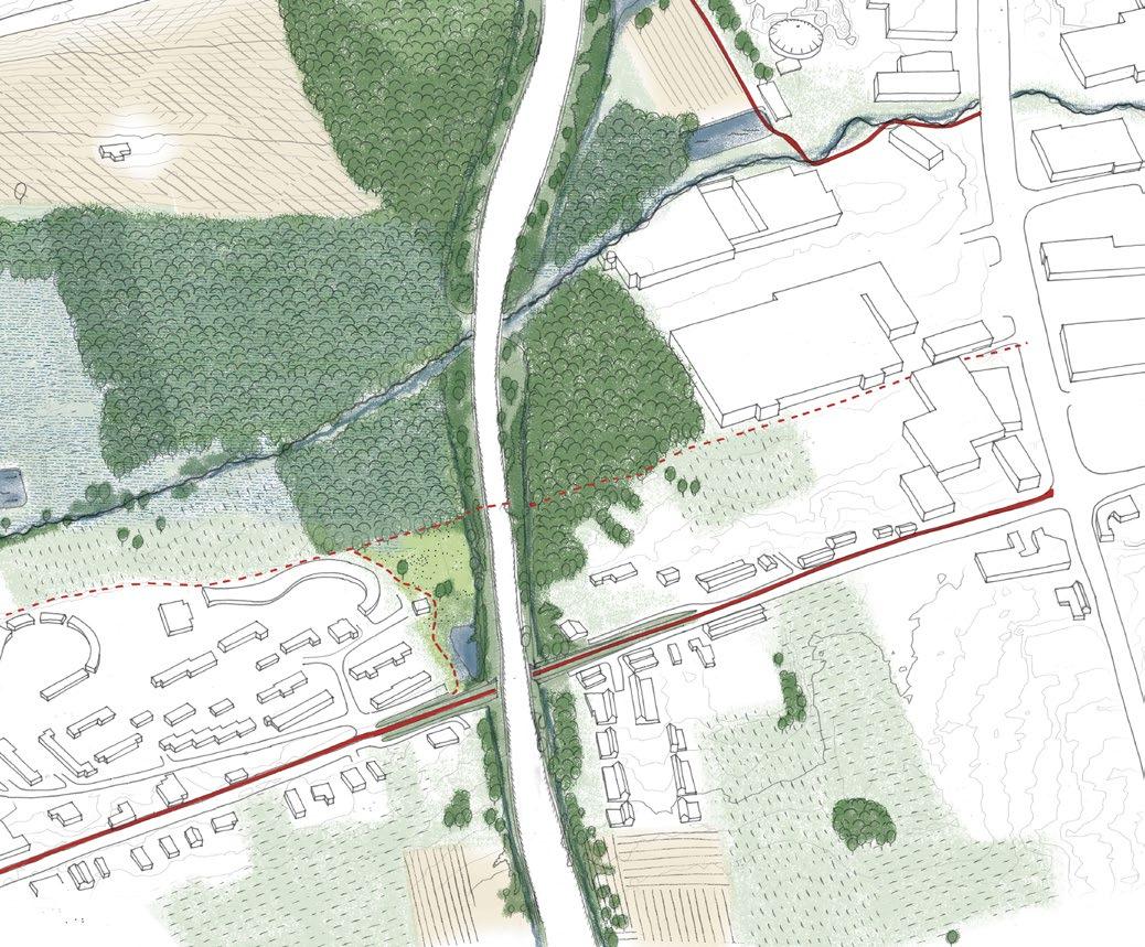 The drawing above shows the different shades of ecology that the project aimed to create. In red are marked the soft mobility routes for biking and walking. In addition, the project aimed to create greater linkages make sure the road does not act as a barrier for urban movement but rather as an opportunity to connect the neighbourhoods.