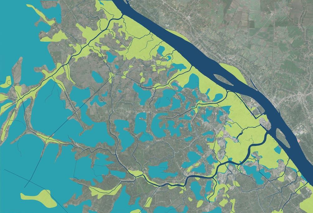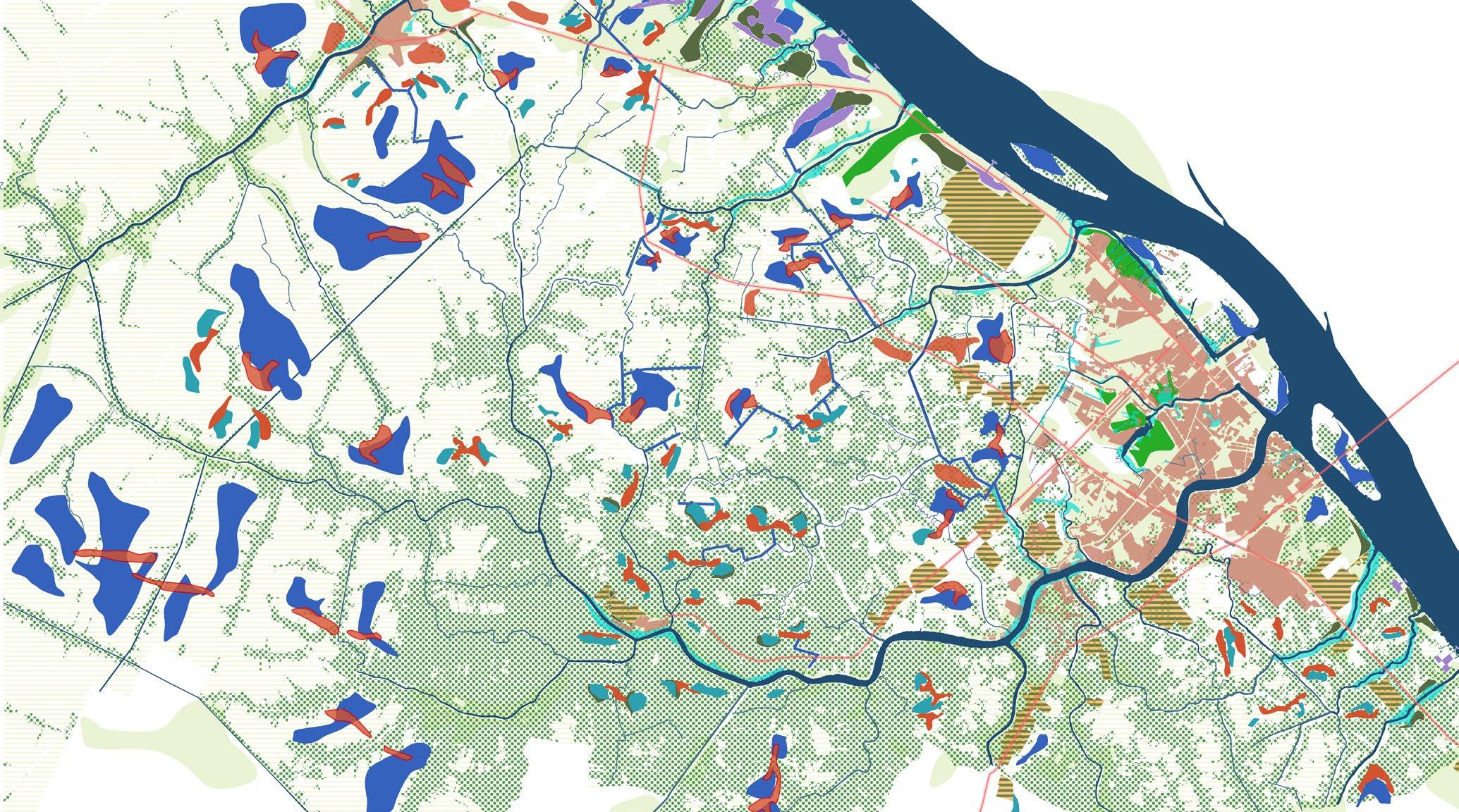 (Right) The places with the highest and lowest elevation levels are marked to identify spaces for forest and water figures. These guide the larger vision for making space for water in the territory. Sediments from the river have created this land and must continue to do so if it is to fight the rising sea levels, land subsidence and sea salination issues.