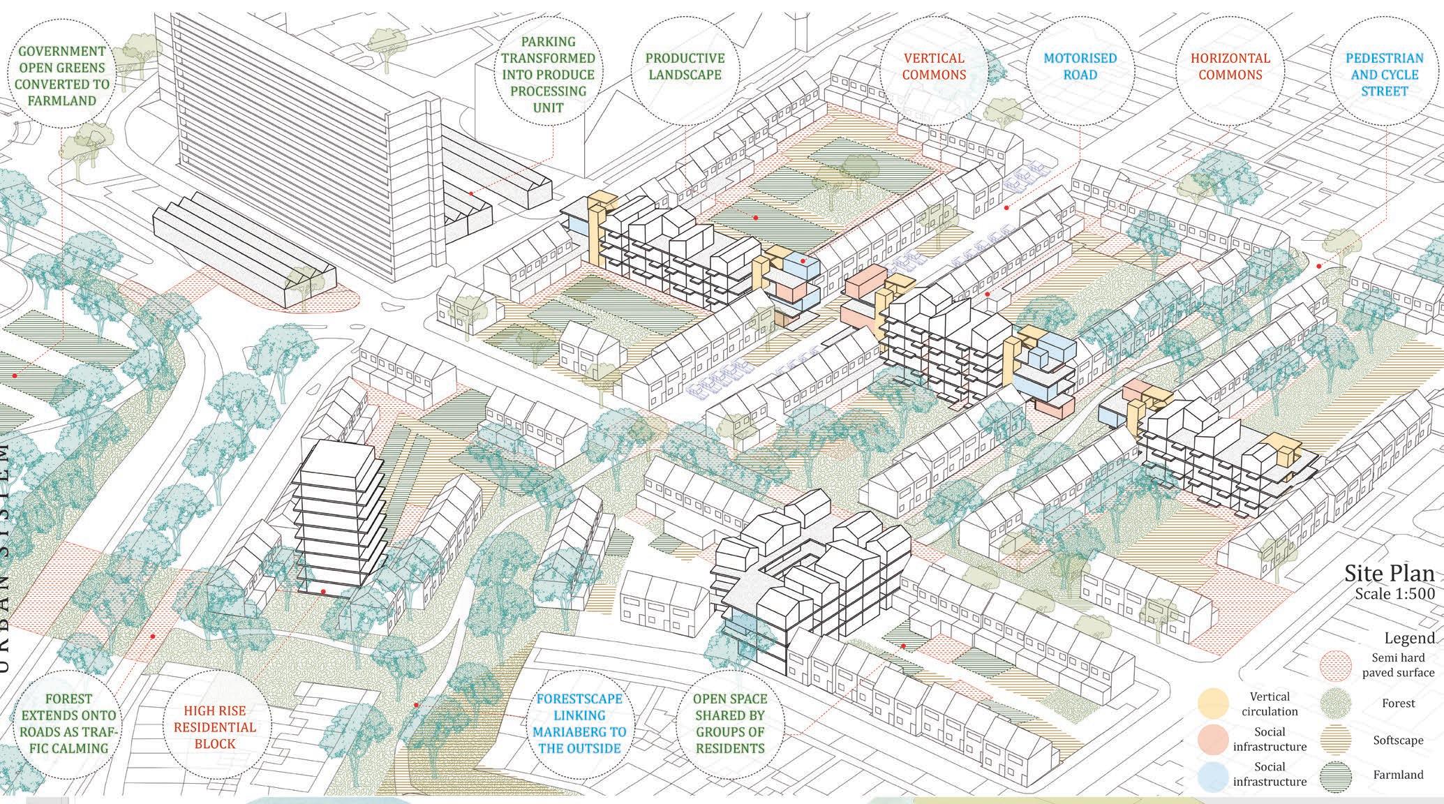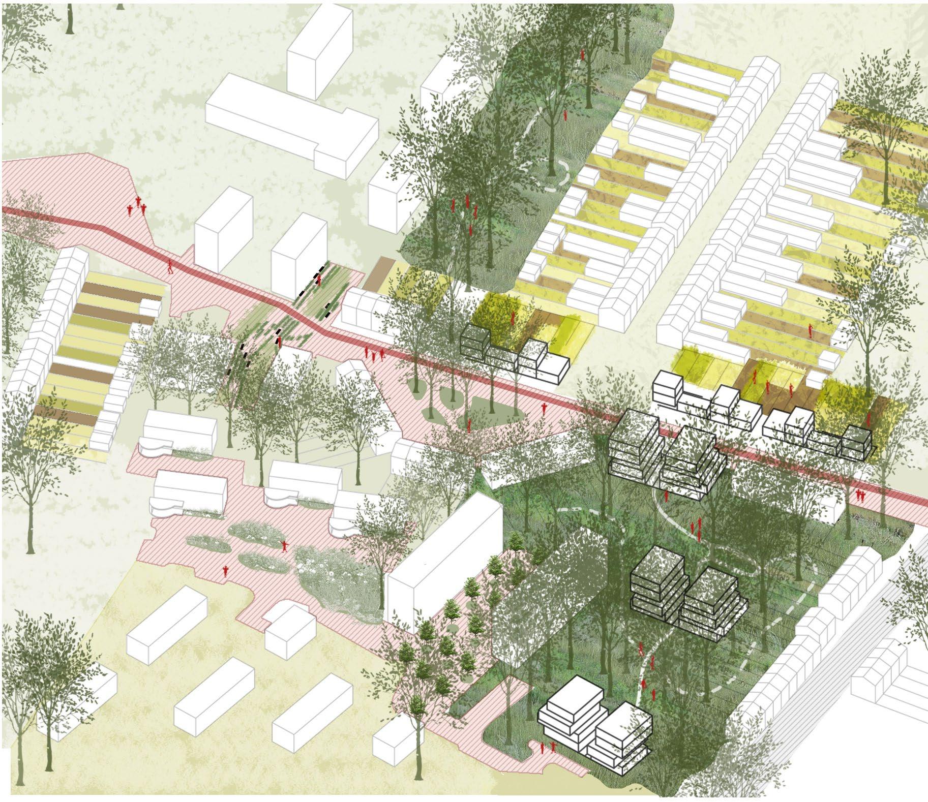 For example, the parcel with a forest floor and large trees, is proposed to be settled with appartment buildings that provide the height and density to allow for this typology to take root.