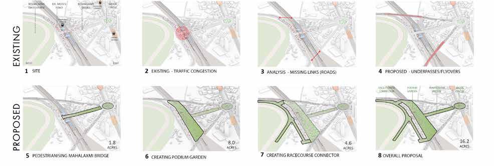 Situated in Mahalaxmi region of Mumbai, India, the junction between Dr. E Moses Road and Bapurao Jagtap road has a heavy traffic flow, with traffic converging at the Mahalaxmi Station junction from all three directions, travelling to and from Jacob circle (locally known as saat rasta -7 roads). The Saat Rasta project is based on connecting the missing links between Dr. E Moses Road and Jacob circle via underpasses and R.O.B’s, thus the overtly congested Mahalaxmi Bridge is turned into a pedestrian bridge with 1.7 acres of space.