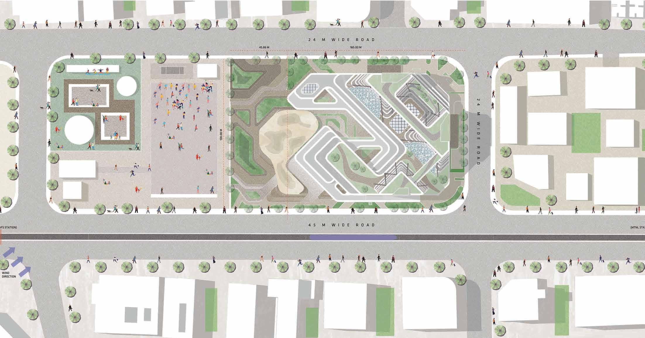The intent of this design is to create a socially inclusive, vibrant and cohesive environment fused with another environment that is becoming highly monouse and programmatic in its nature, (and evolving to be isolated and fragmented in the present due to inconsiderate and capitalist approach), as an example for various zones with highly monouse functions. In turn fostering the fabric of the city by eliminating these socially isolated zones.