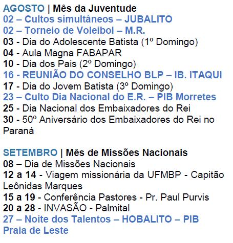 17 DOMINGO EBD 9:00h – DIA DO JOVEM BATISTA ENCERRAMENTO DE MISSÕES ESTADUAIS