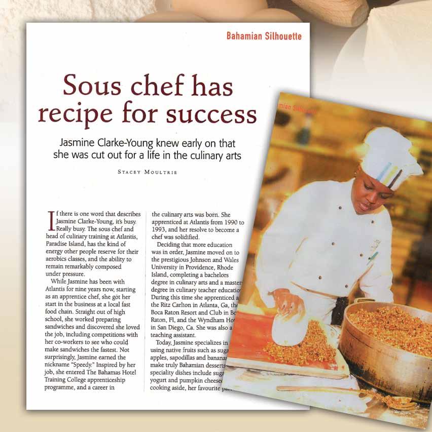 In 1993, she enrolled in a Bachelor Degree program in Culinary Arts and Food Service Management at Johnson & Wales University; Providence, Rhode Island. Representing her university, she won a silver medal at the Boston Food Show. Jazz also placed first in another culinary competition held in London, England. For this competition she represented the United States of America but being Jazz, she asked her lecturer if she could represent The Bahamas instead. When told that she couldn’t, she decided to continue on anyway and walked away with a gold medal. After completing the Bachelor’s program at the age of twenty, she decided to stay and complete a master’s degree in Culinary Education. Jasmine became the first female Bahamian to earn this degree. In 1997 she received the most outstanding Pastry Student of the Year award and graduated as class valedictorian. As a result she delivered the commencement address.