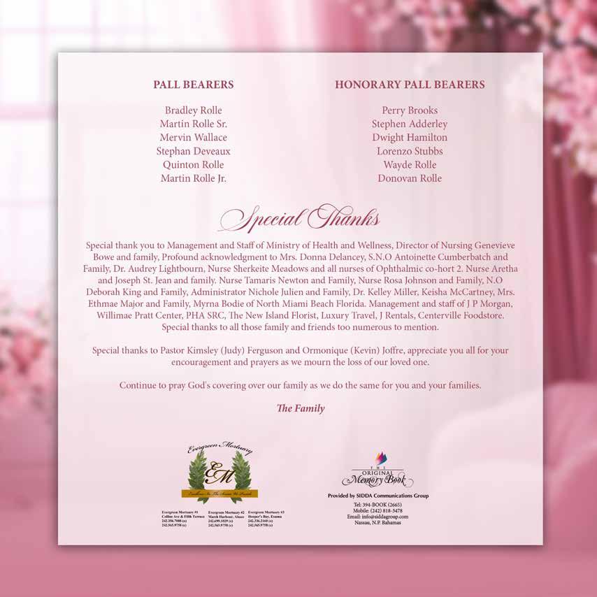 Bishop VG Clarke and Family, Bishop Cooper and Family, Lady Dame Margaret Pindling and Family, Officers and Members of The Church of God Bahamas, Pastor Perry Newton and Family; Wallace Family (End Time Church); The Rolle Family, Alice Josey and Family; The Beckford Family; Lillian Rolle and Family; Sheila Butler and Family; Cleomi Saunders and Family; Julia Bain and Family; Curlean Fernander and Family; Leotha Whylly and Family; Clayton, Bishop Sanford, Valentino, Horatio Rolle and Family; Pamela (Meril) Storr, Denise (Clarence) Hinzey, Quinton (Lacal) Rolle, Gertel (Joseph) Moxey, Natasha (Jackson) McPhee , Kimberly (Bacchus) Rolle, Wayde (Tia) Rolle , Ulander and Leah Rolle, Robert and Debbie Ann Rolle, Craven (Coretta) Rolle, Pyvonne Schmid, Minister Leviticus, Melvin, Ashel, Delcie, Pollyann, and Angie Rolle, Estella Rolle and Family, Sandra (Lynden) Jennings, Roderick (Patrice) Rolle , Lynette (James) Honeysuckle, Deordie (Thomas) Charlton, Andrea Rolle Barr and Family, Rev. Dr. Ivanford Butler (Kemp Road Ministries); Pastor Rickeno Moncur (Revolution Church), Willie Mae Pratt Centre for Girls, Odessa Sargent and Family; Nora Pinder and Family; Deanne Pinder and Family; Iris Dean and Family; Bernice (Revy) Francis and Family; Dwight (Apostle Brenda) Pratt and Family; The Marshall Family; Bishop Robert McPhee and Family; The Lightbourn (Cecile) Family; The Curry (Monique) Family; Curtis (Heather) and Family; Scott (Paulette) Family; Dr. Naydon Sutherland and Family, a host of persons too numerous to mention who has impacted her life!