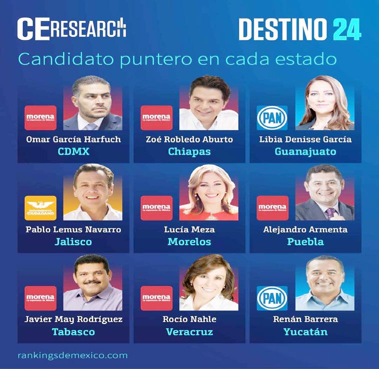 Tuxtla.- La encuesta Destino 24, de la casa encuestadora C&E Reasearch, publicó su ranking nacional de candidatos punteros en cada de estado de la República para el proceso electoral 2024. En este informe se destaca que de las nueve gubernaturas que estarán disputándose el próximo año, seis serían para perfiles del Movimiento de Regeneración Nacional (MORENA).