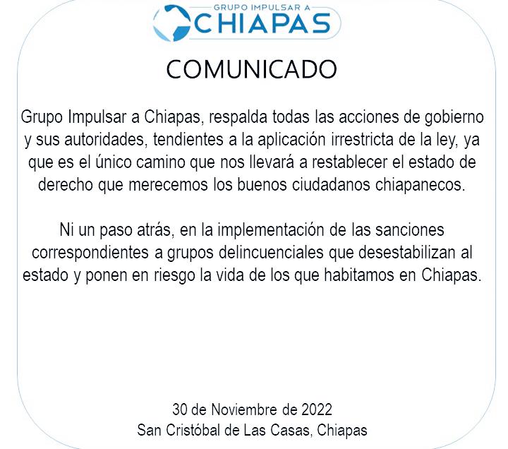 “Ni un paso atrás en la implemen tación de sanciones correspon dientes a grupos delincuenciales que desestabilizan al estado y ponen en riesgo la vida de los que habitamos en Chiapas”, señalaron en al pronunciar su posiciona miento.